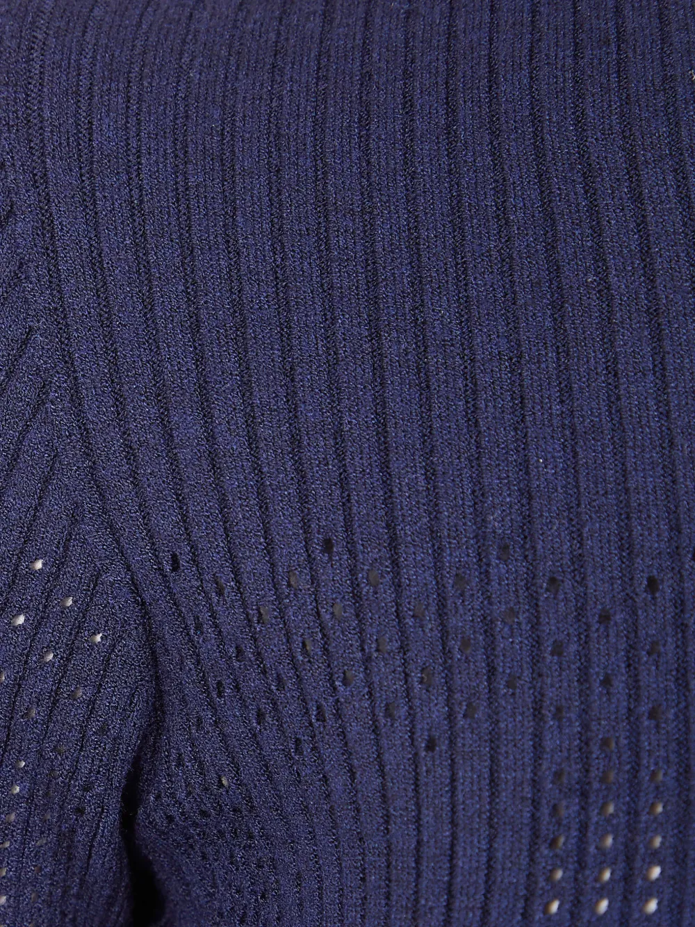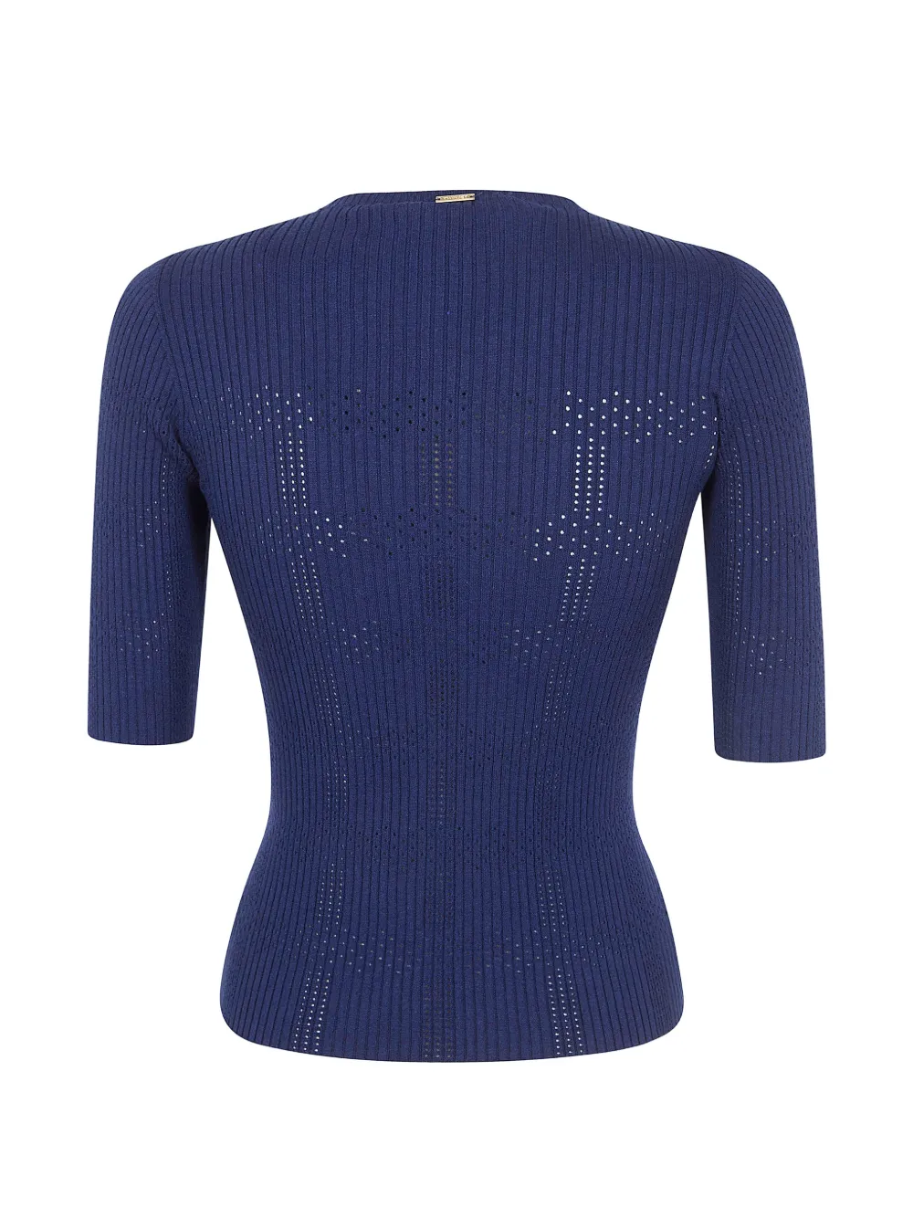 Темно-синяя в рубчик трикотажная кофта с круглым вырезом и рукавами три четверти