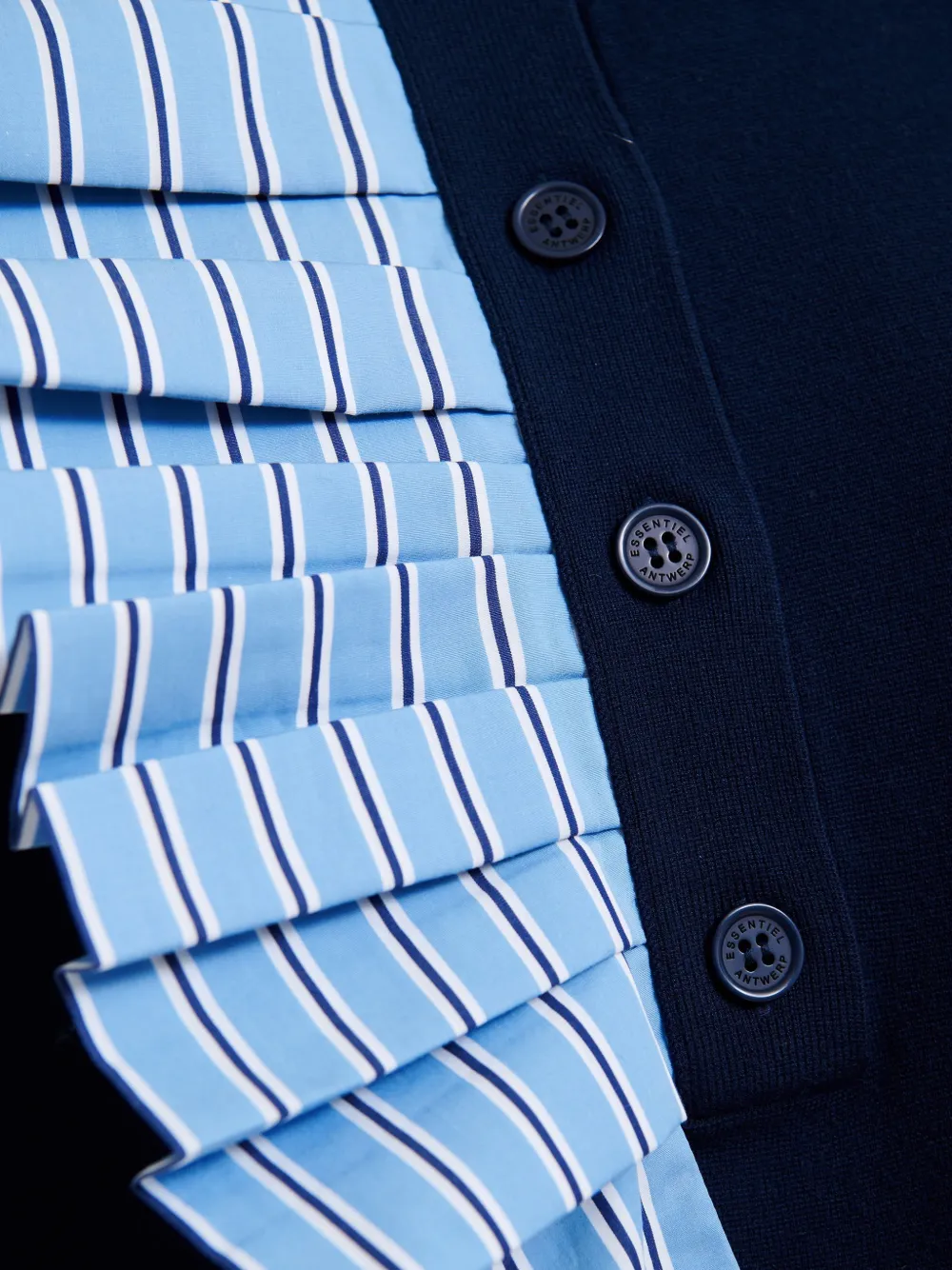 Светло-голубой с полосатой отделкой, короткие рукава, однотонные пуговицы, воротник "поло"