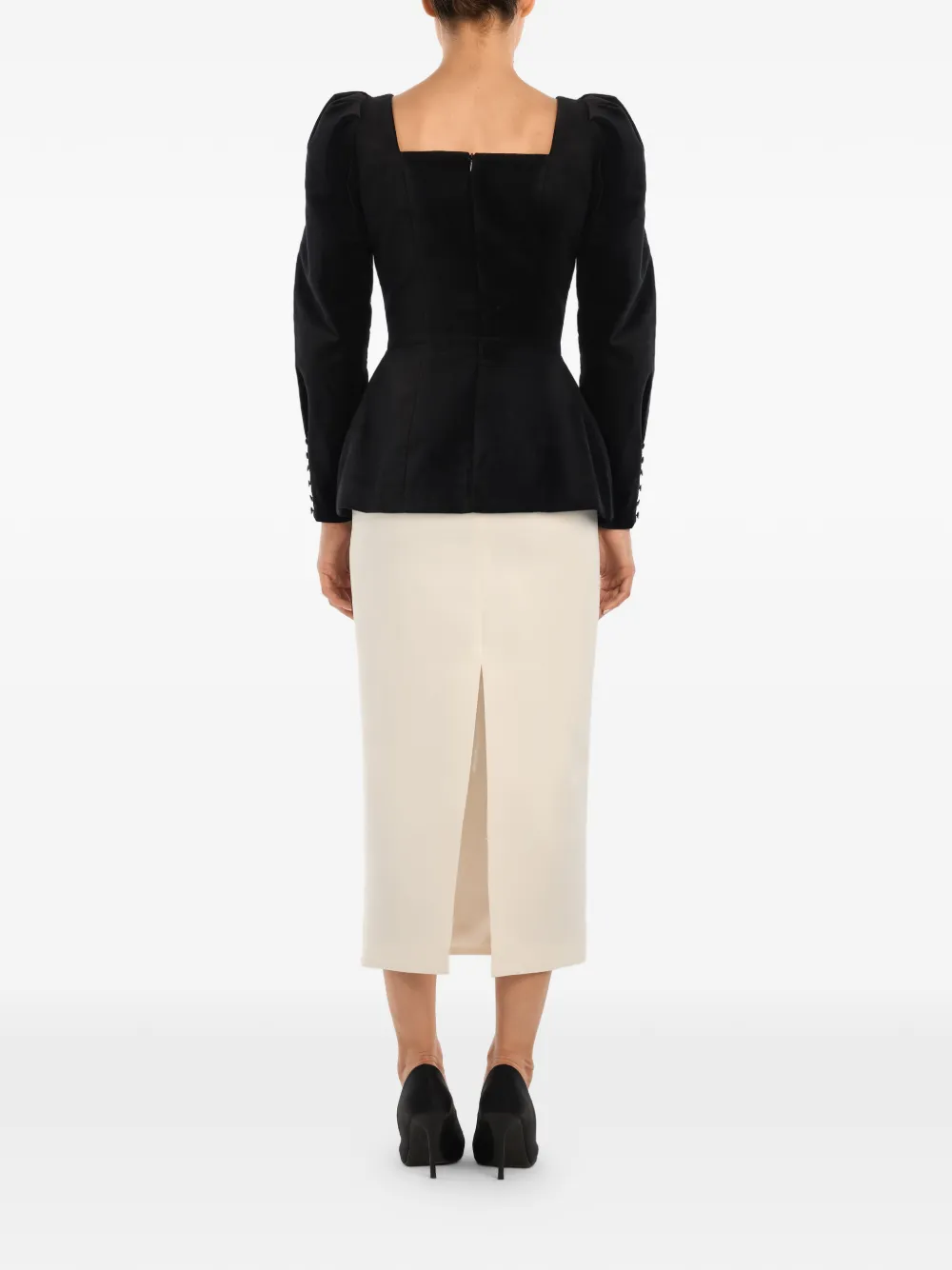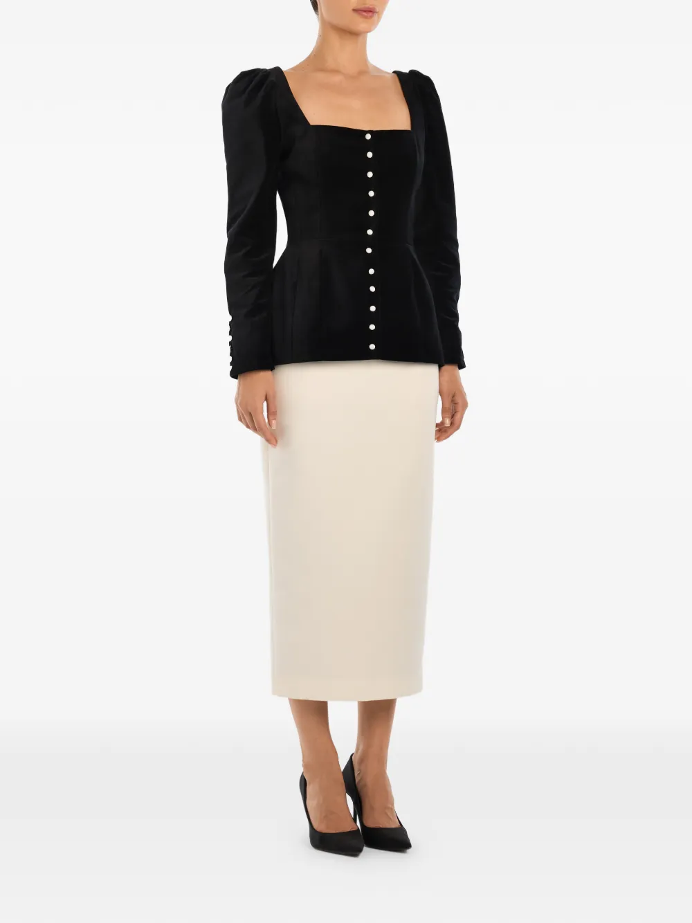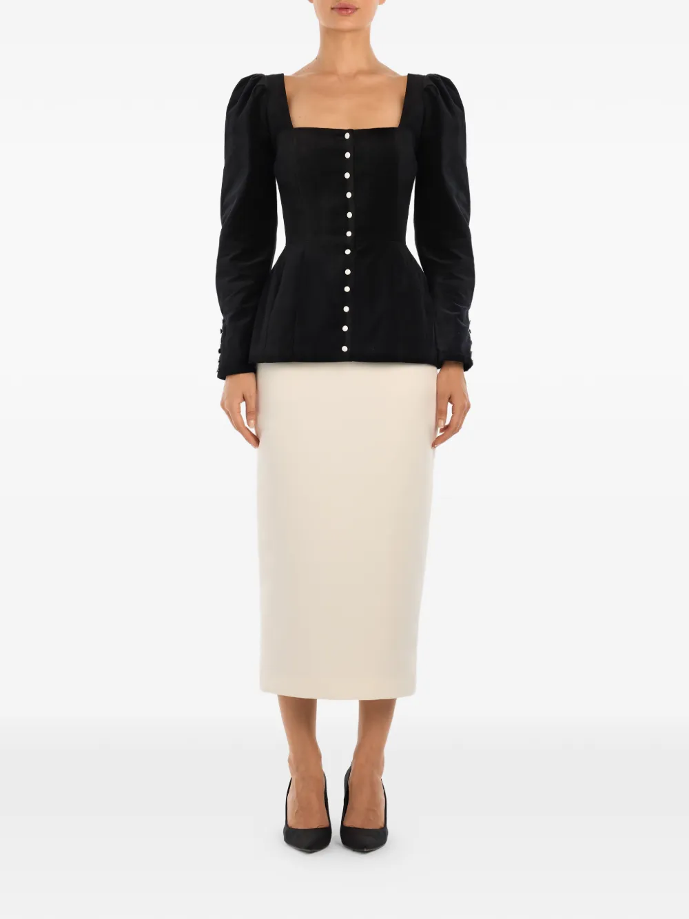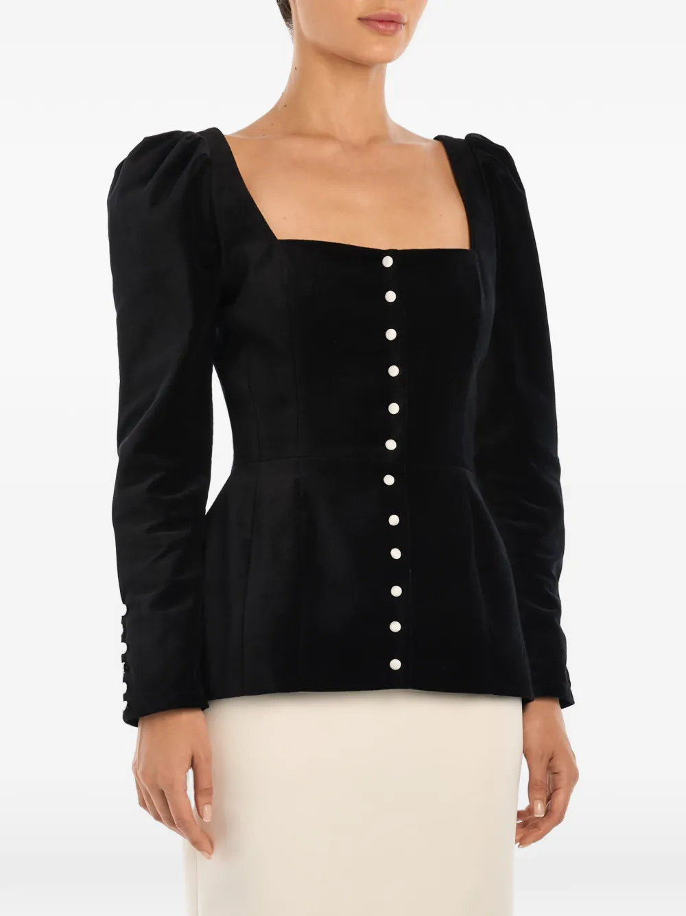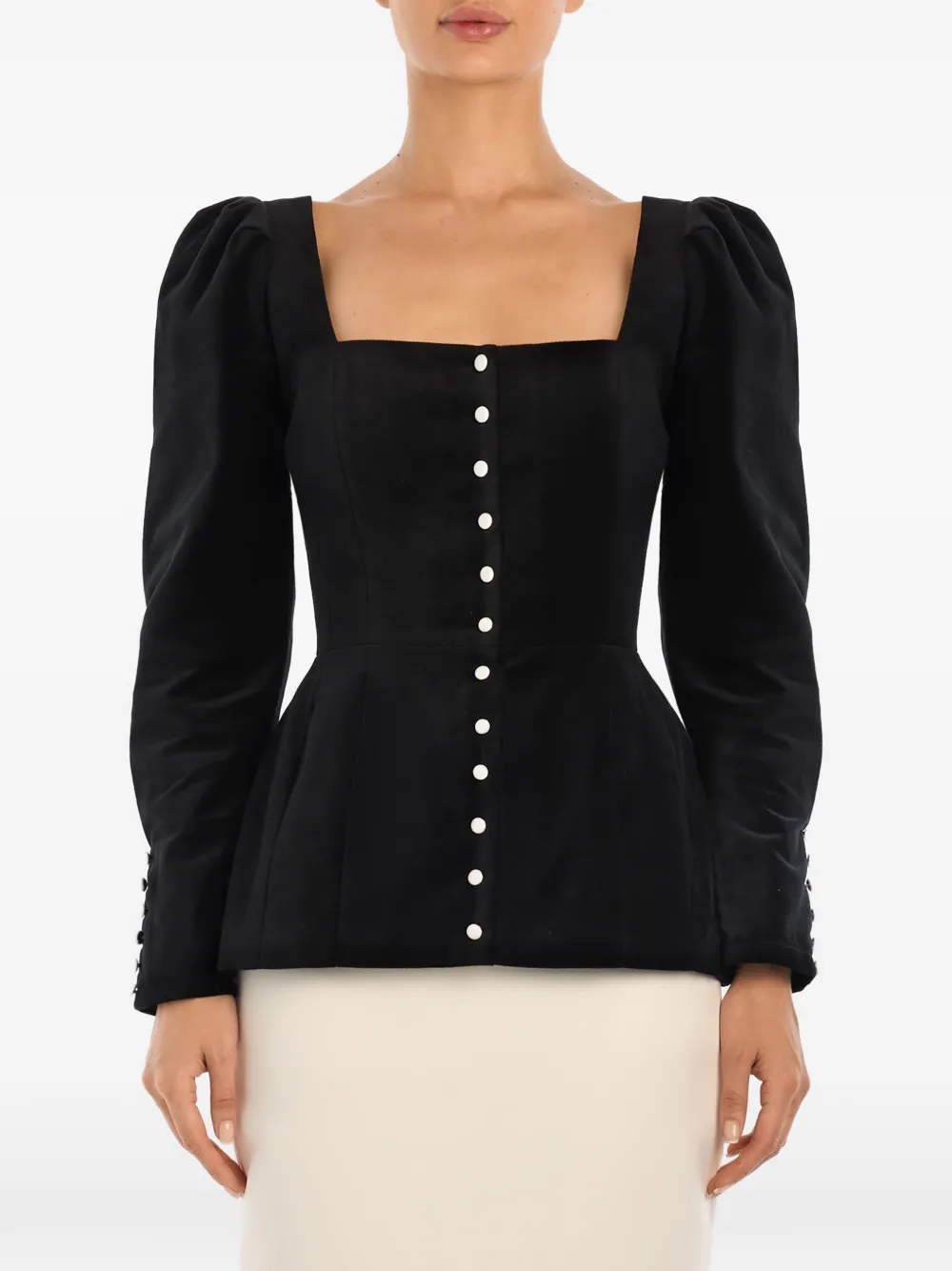 Черный топ с квадратным вырезом, застежкой на пуговицы, длинными рукавами и манжетами на пуговицах