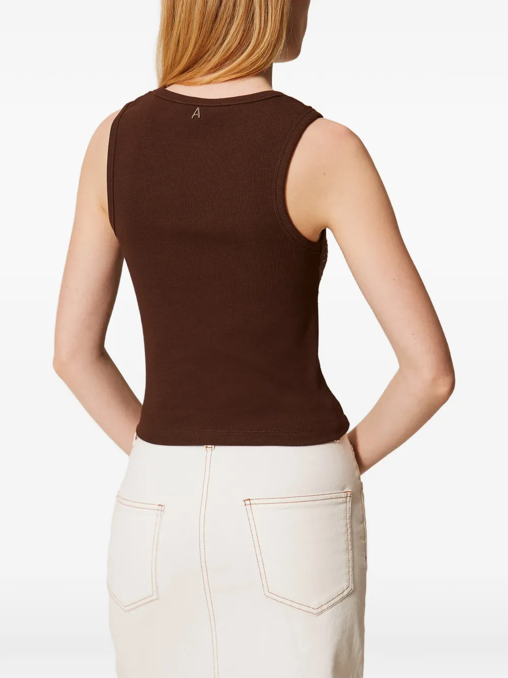 Шоколадно-коричневый вязаный топ в рубчик с вышивкой, круглый вырез, без рукавов