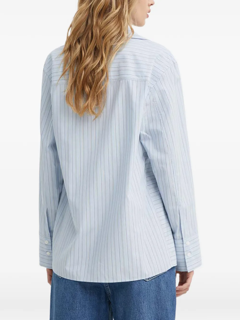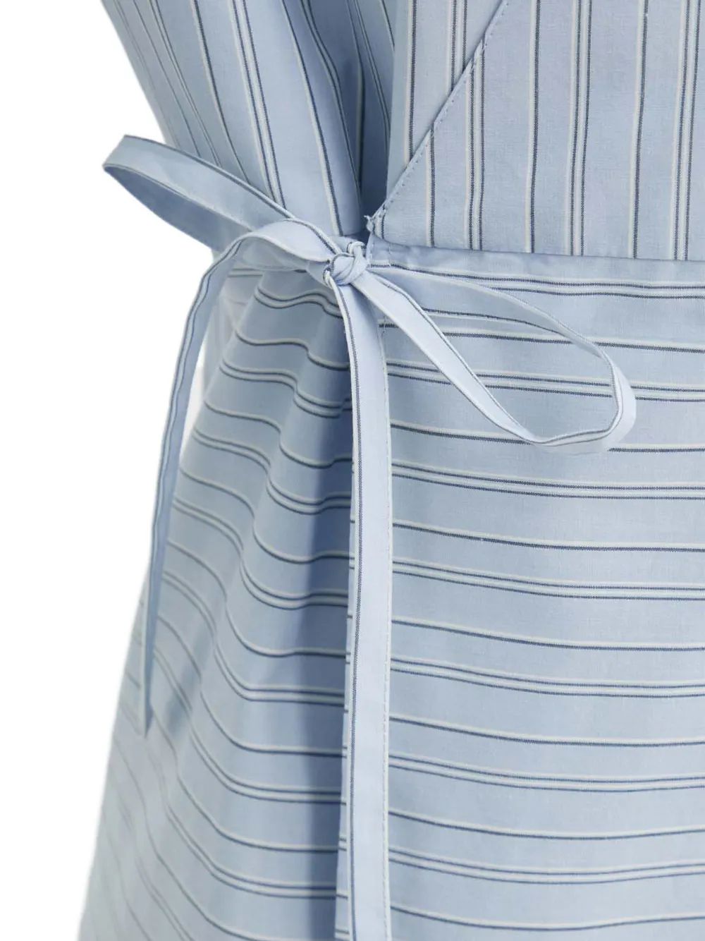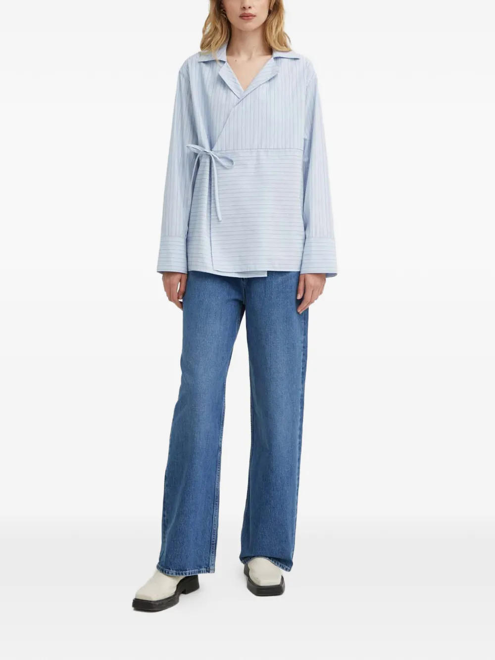 Голубая полосатая блузка с запахом, лацканами, длинными рукавами и завязывающимся поясом
