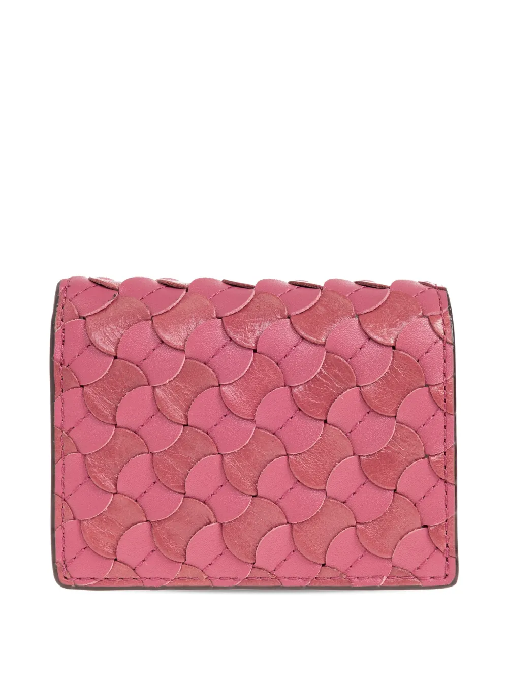 Розово-коричневый цвет, фигурный край, фурнитура серебристого оттенка, клапан с застежкой-кнопкой, внутренние отделения для карт, металлический логотип
