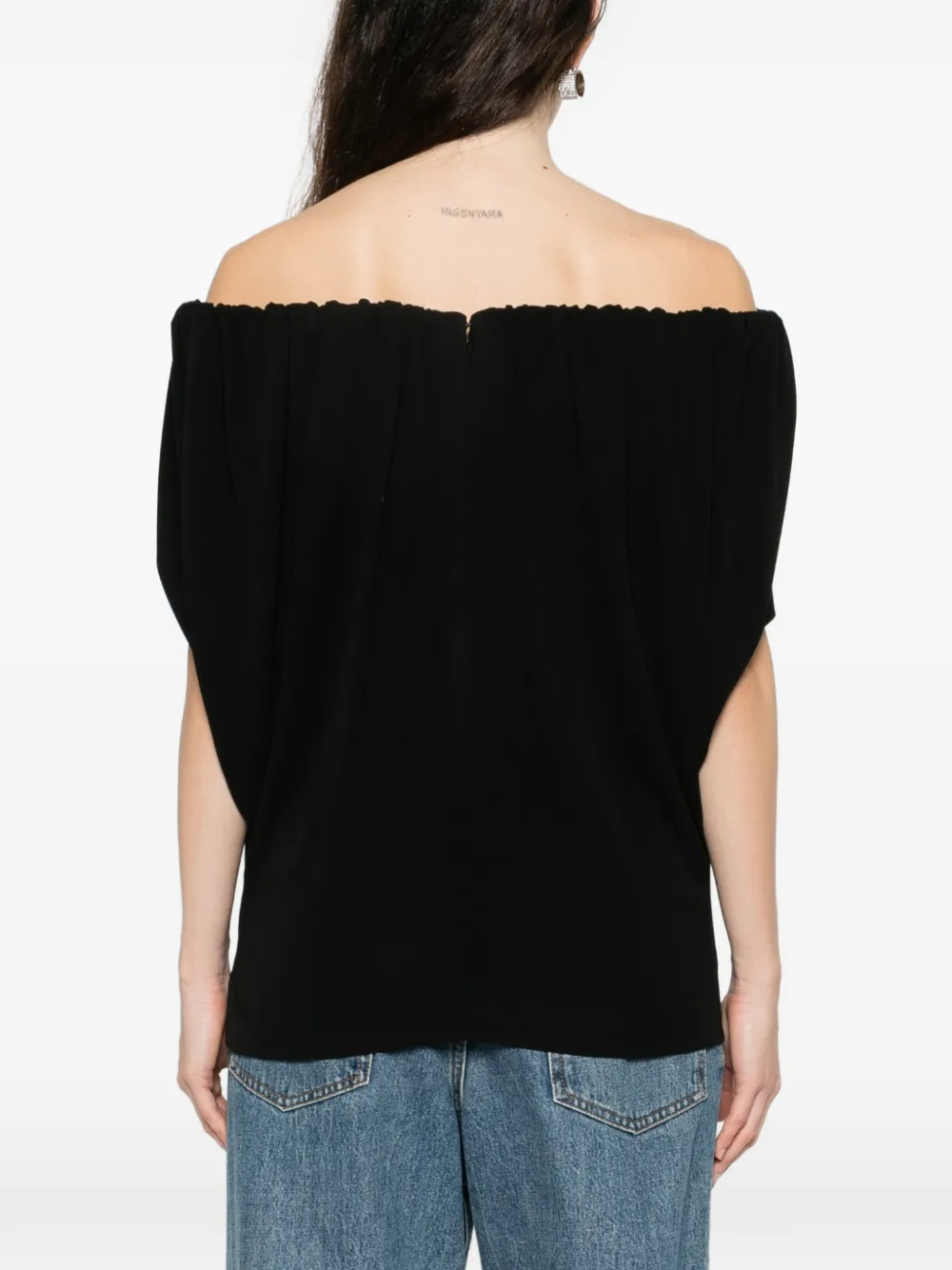 Черный цвет, вырез "кармен" (обнажающий плечи), короткие рукава, присборенная отделка, застежка-молния сзади