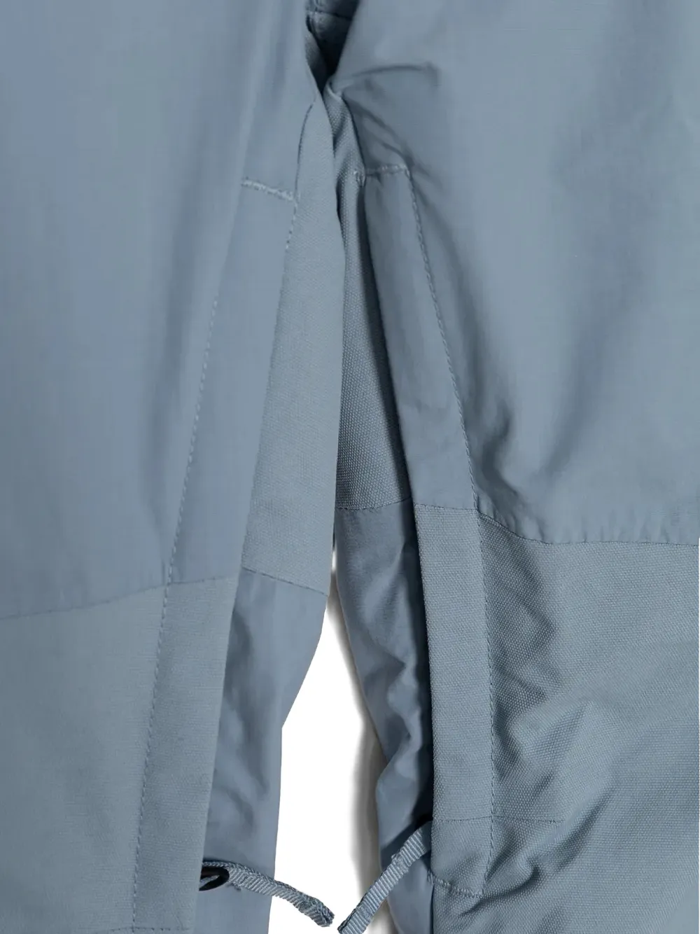 Пыльно-голубой цвет, карман на молнии, боковая кулиска, шлевки для ремня, накладной карман с клапаном, застежка на пуговицу