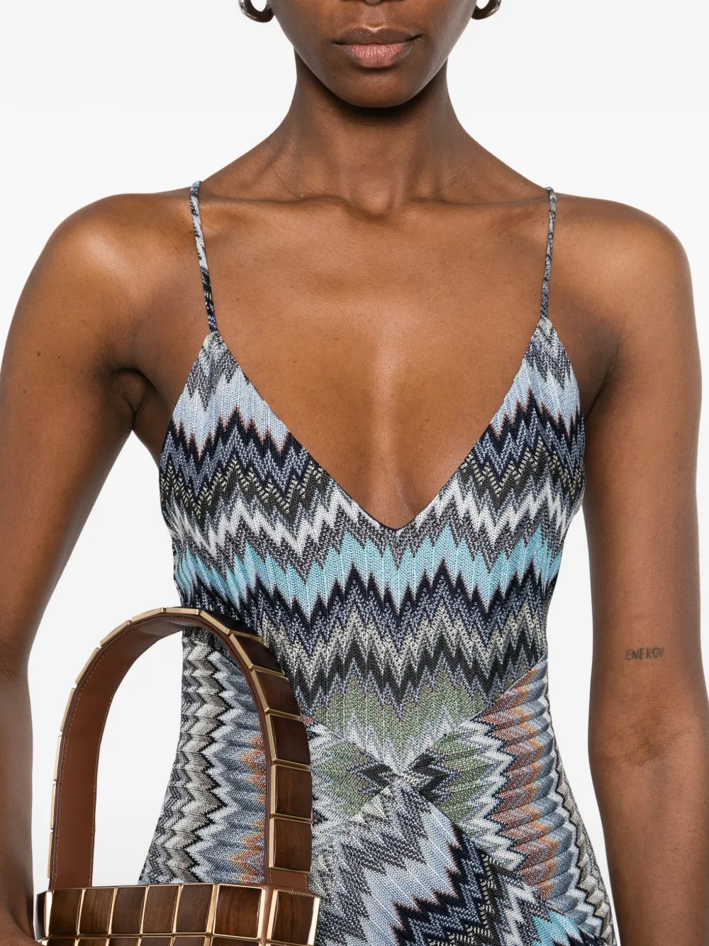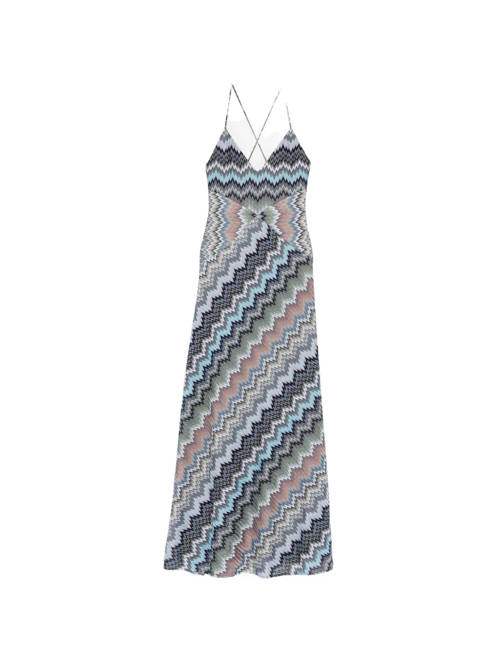 Светло-голубой, с зигзагообразным узором, перекрещивающиеся бретели, V-образный вырез, без рукавов, макси длина. Полученный вами товар может незначительно отличаться от изображенного на фото. Это связано с ручной работой, с которой создаются все изделия Missoni.