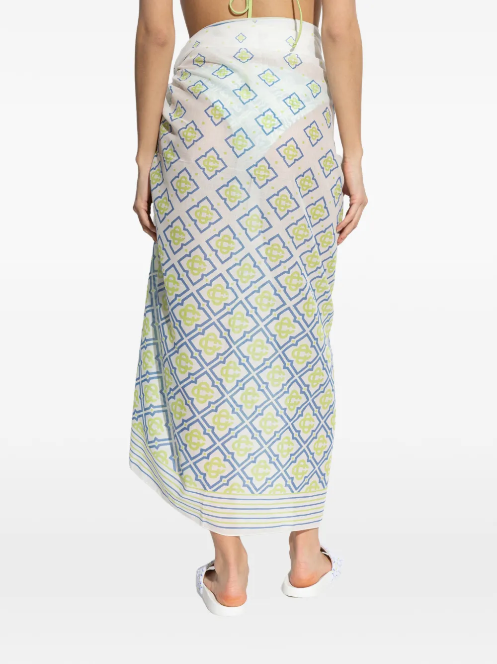Белый с монограммным рисунком, с полосатыми отделками, запахом и боковой завязкой