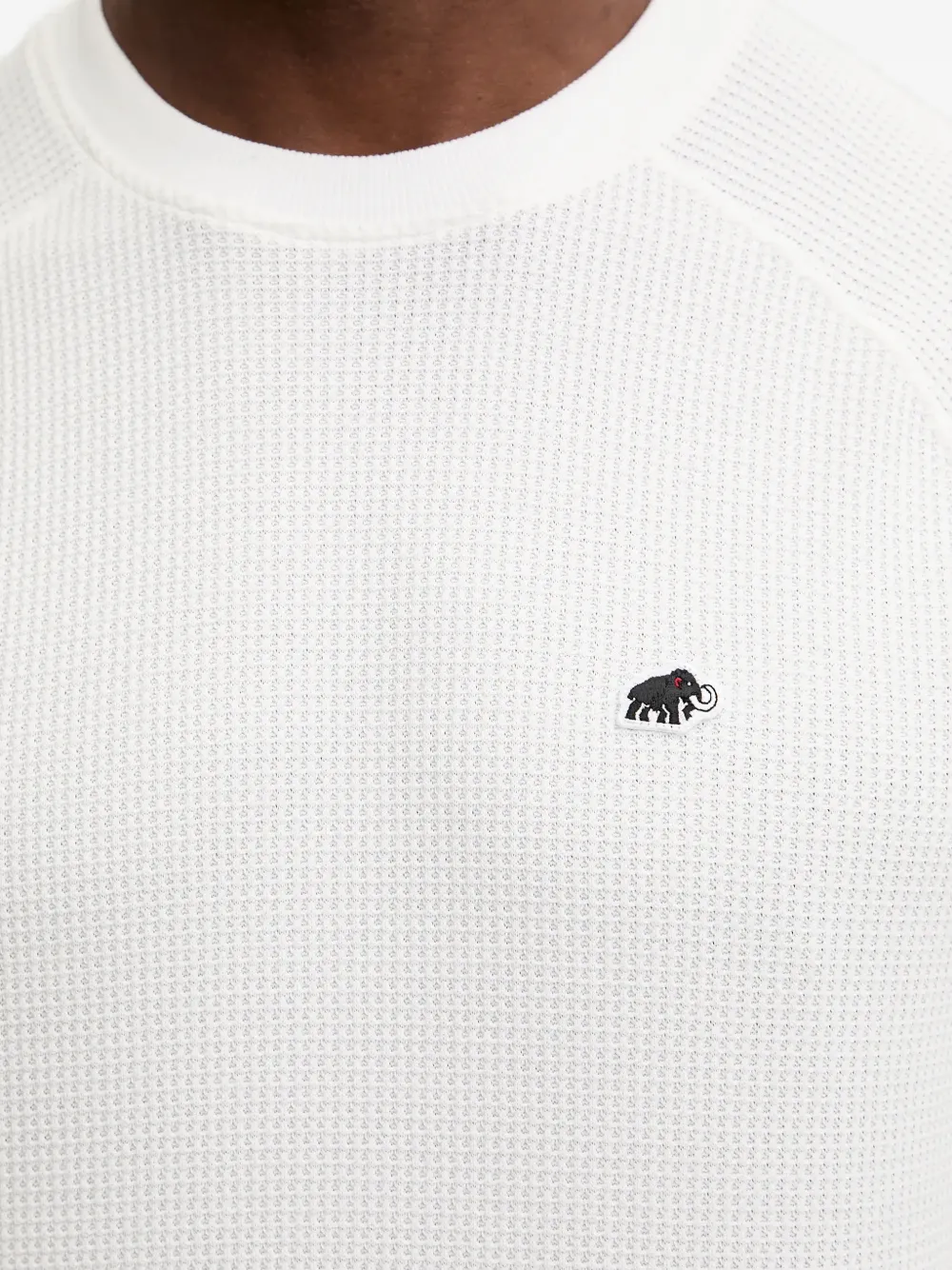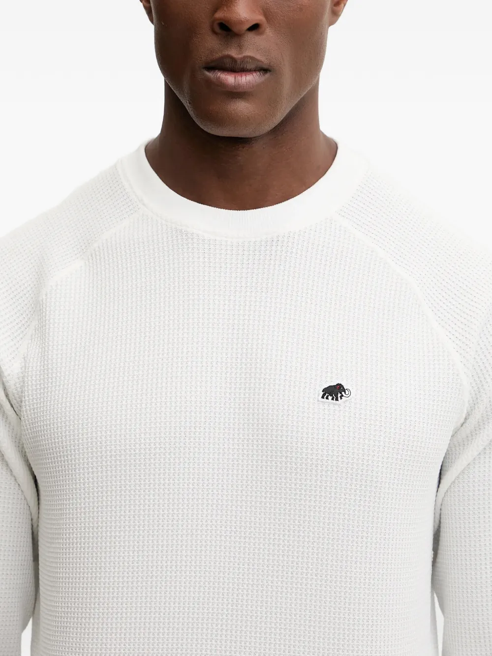 Белый лонгслив с круглым вырезом, длинными рукавами, вафельной вязкой, нашивкой с логотипом и прямым подолом