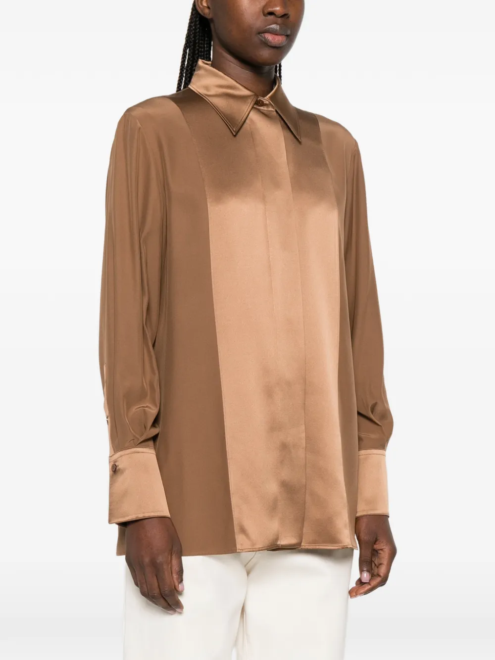 Корица, сатиновая отделка, застежка на пуговицы, воротник с острыми концами, длинные рукава, манжеты на пуговицах