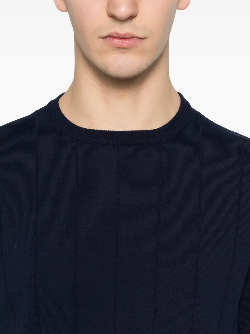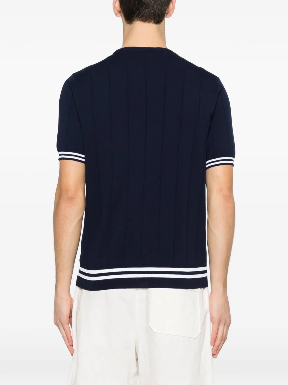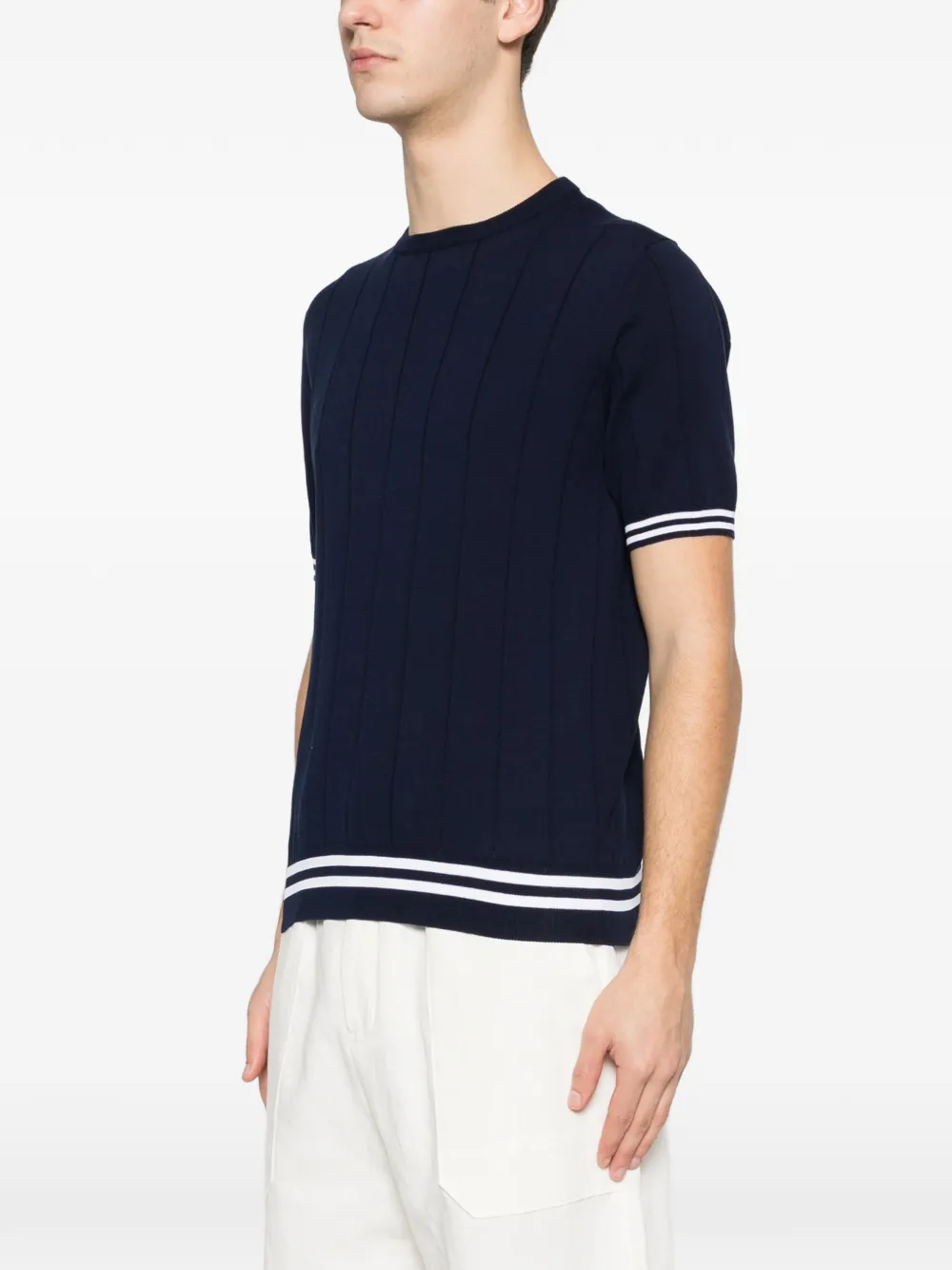 Темно-синий в рубчик, круглый вырез, полосатый край, полосатые манжеты, короткие рукава