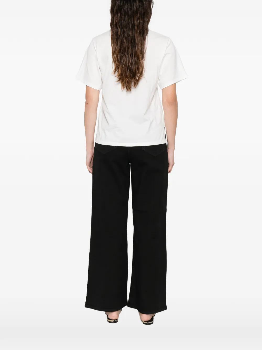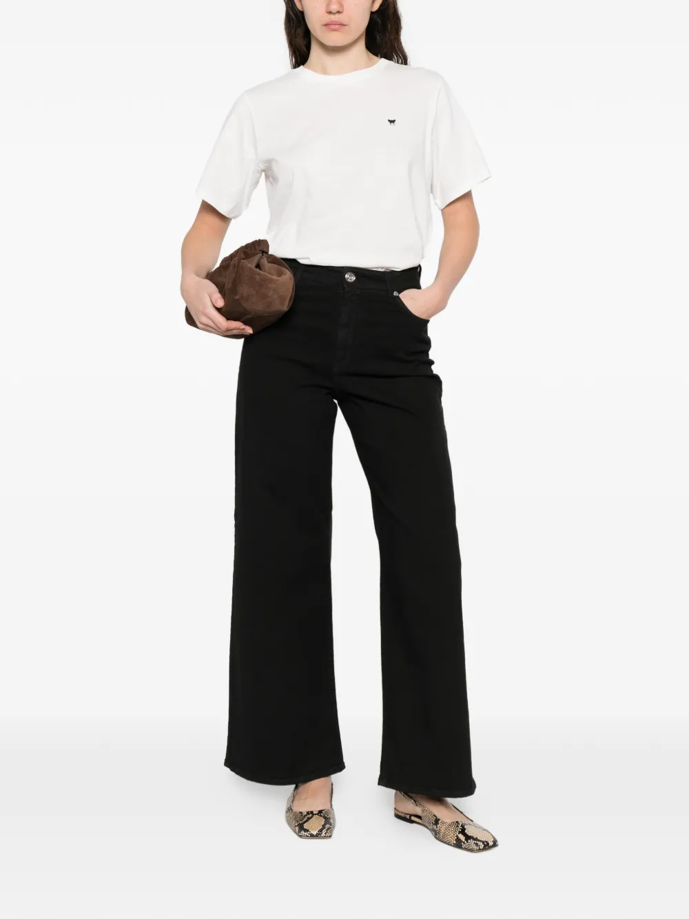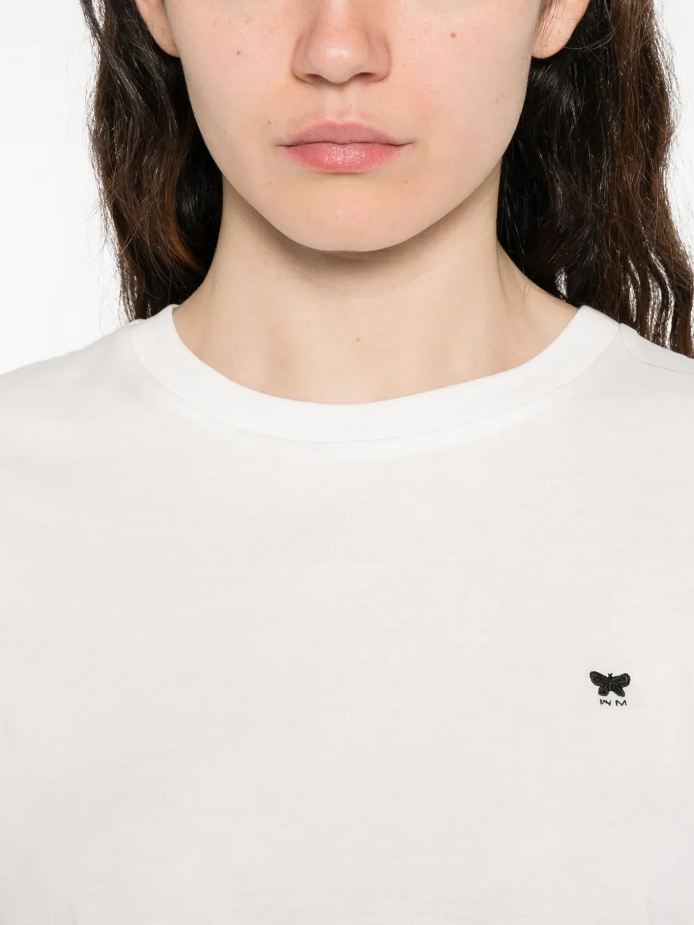 Белая футболка с вышитым логотипом, круглым вырезом и короткими рукавами
