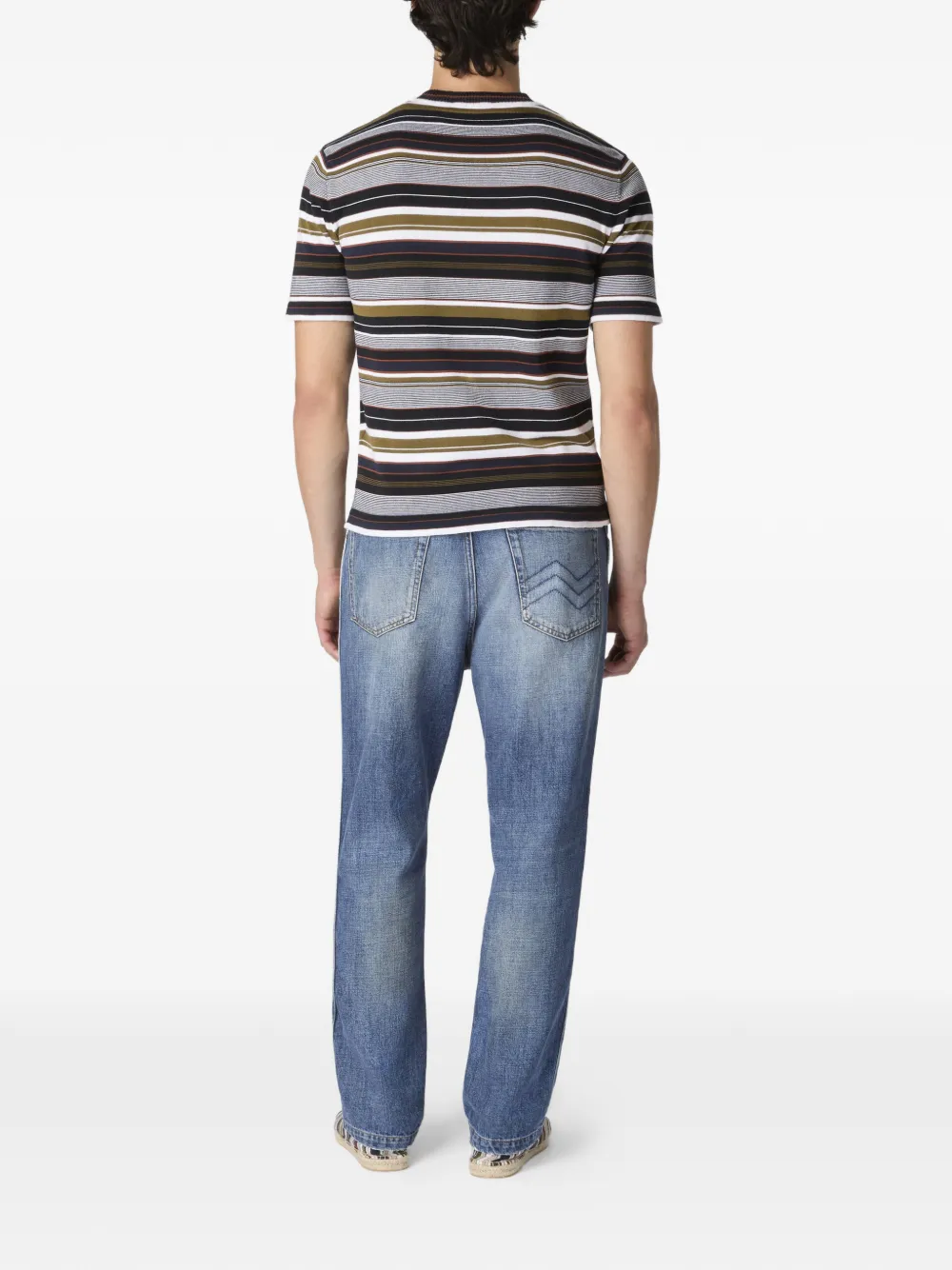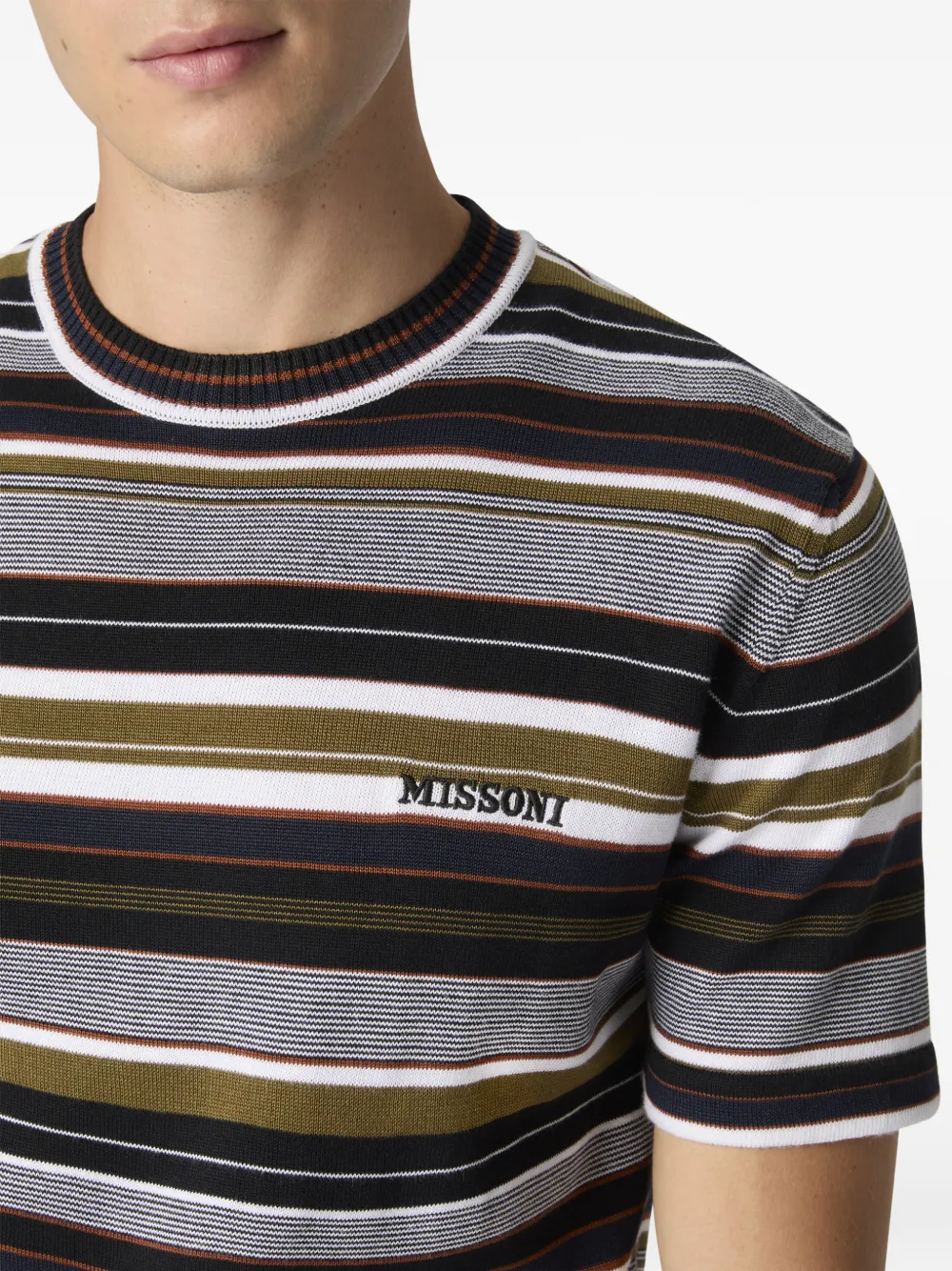 Серый в полоску, круглый вырез, короткие рукава, вышитый логотип, ребристые детали. Полученный вами товар может немного отличаться от изображенного на фотографии. Это связано с ручной работой, благодаря которой изготавливаются все изделия Missoni.