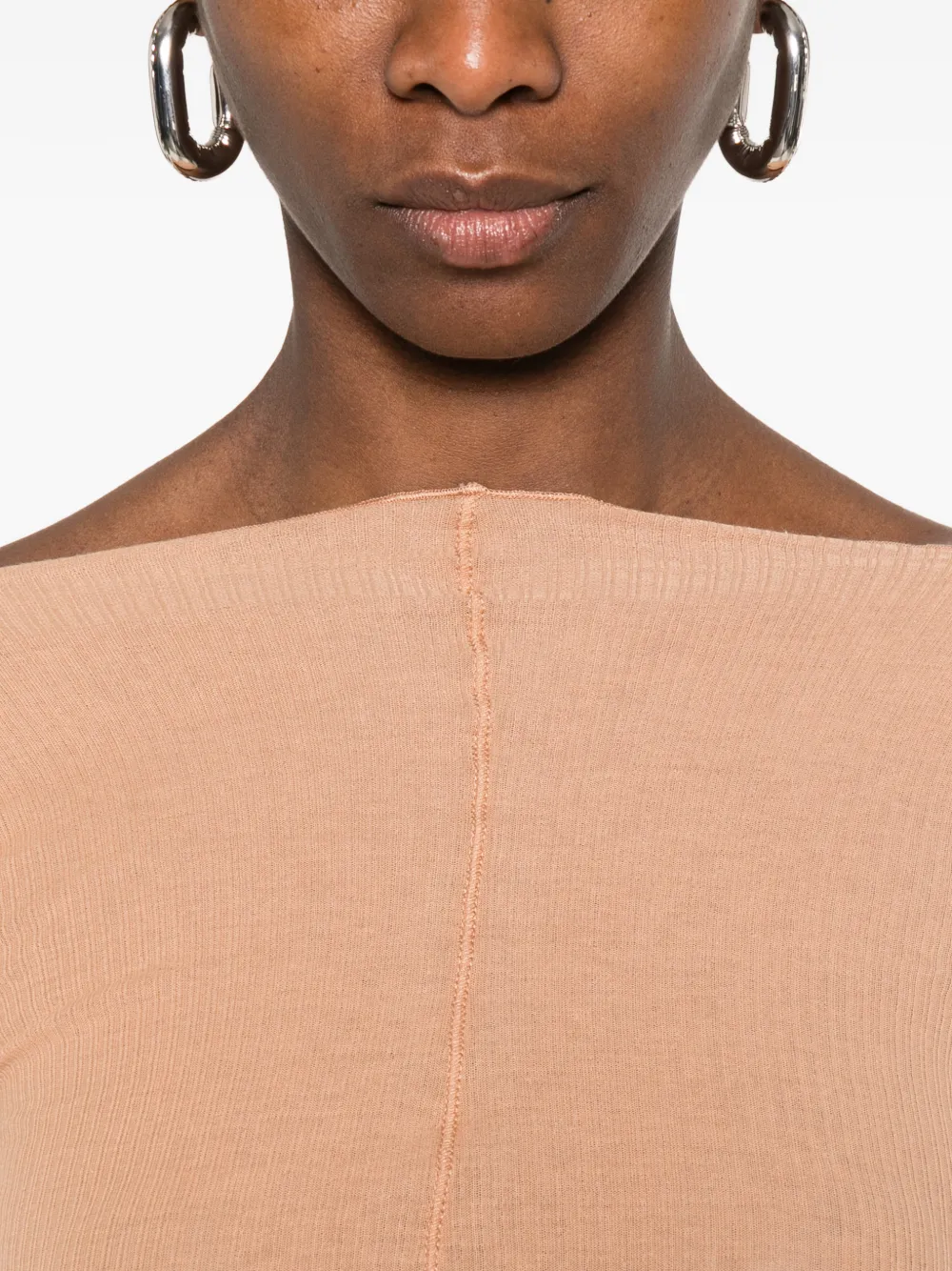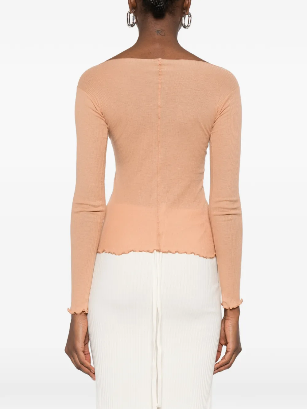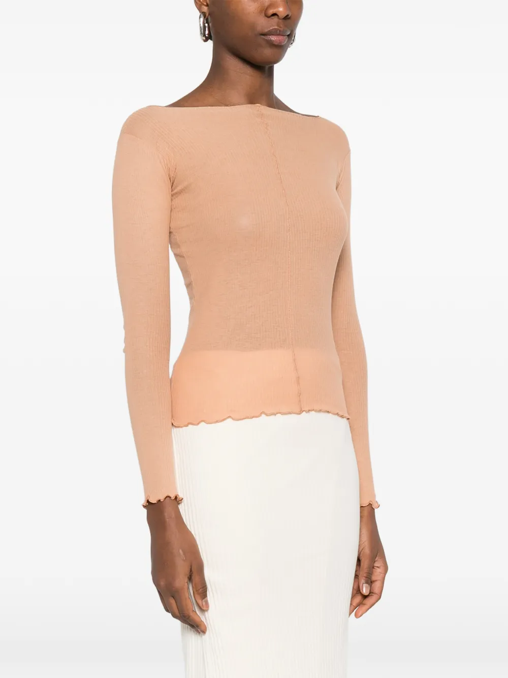 Бежевый топ с длинными рукавами, лодочкой, декоративными швами и волнистым краем