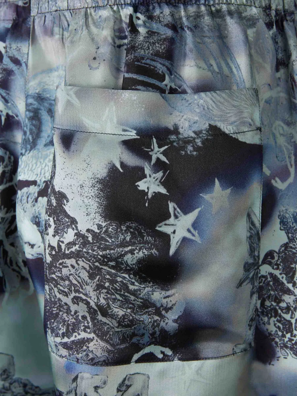 Синий с графическим узором, накладные карманы, эластичный пояс