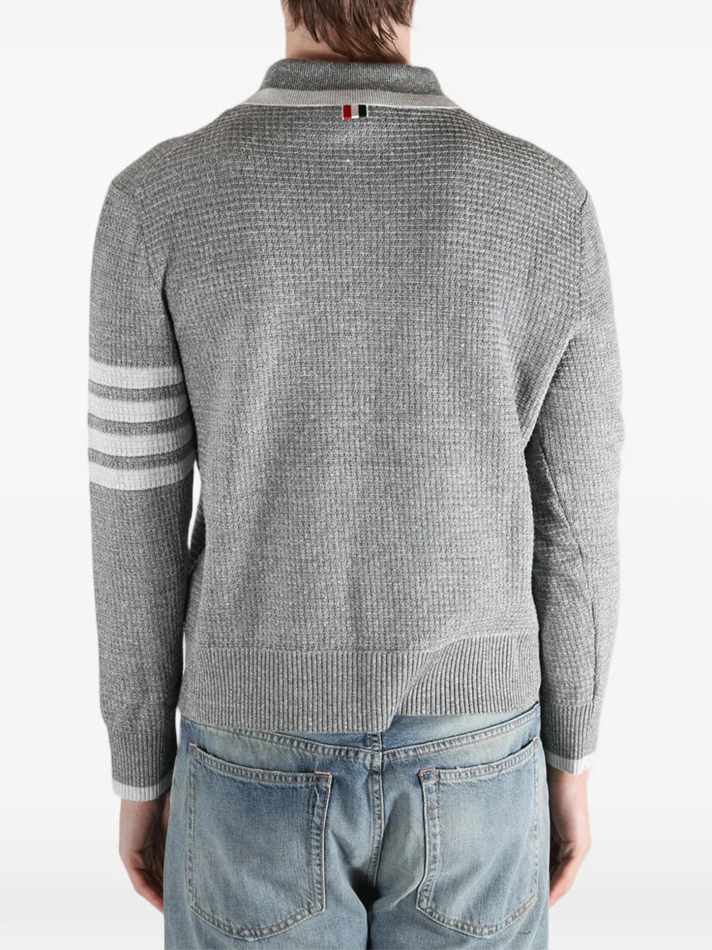 Серый фактурный трикотаж с четырьмя полосками на рукаве, нагрудным карманом, застежкой на пуговицы, ребристым низом