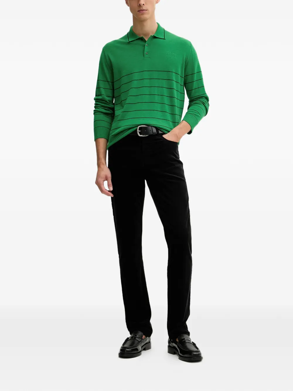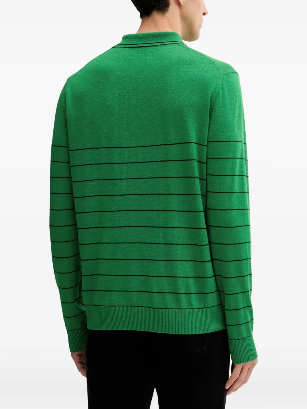 Зеленая рубашка в полоску с поло-воротником, застежкой на пуговицы и длинными рукавами