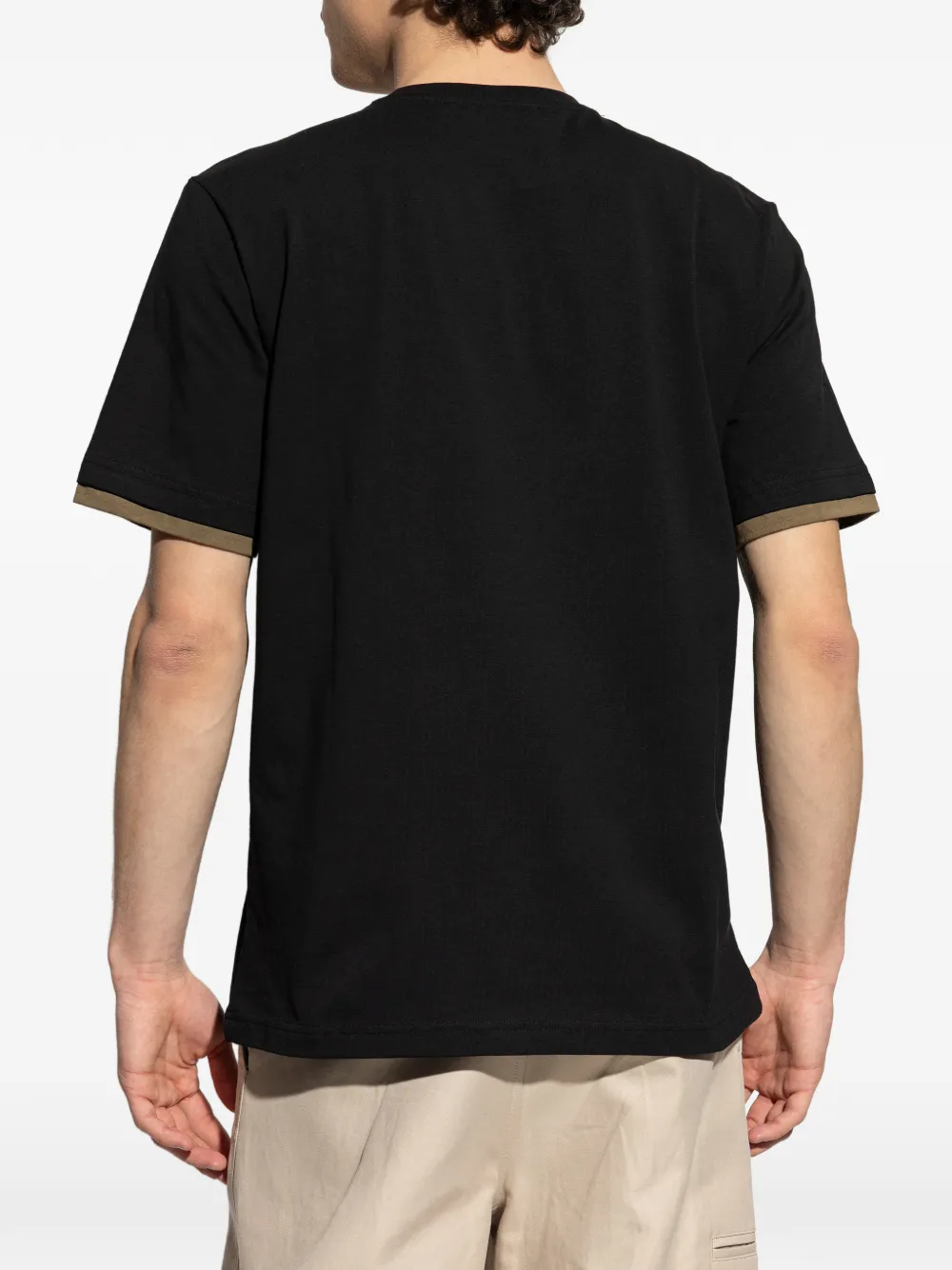 Черная нашивка спереди, круглый вырез, короткие рукава, контрастная отделка на рукавах