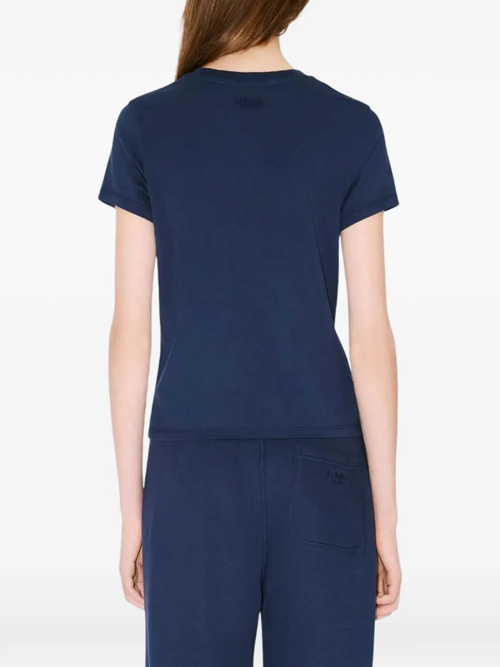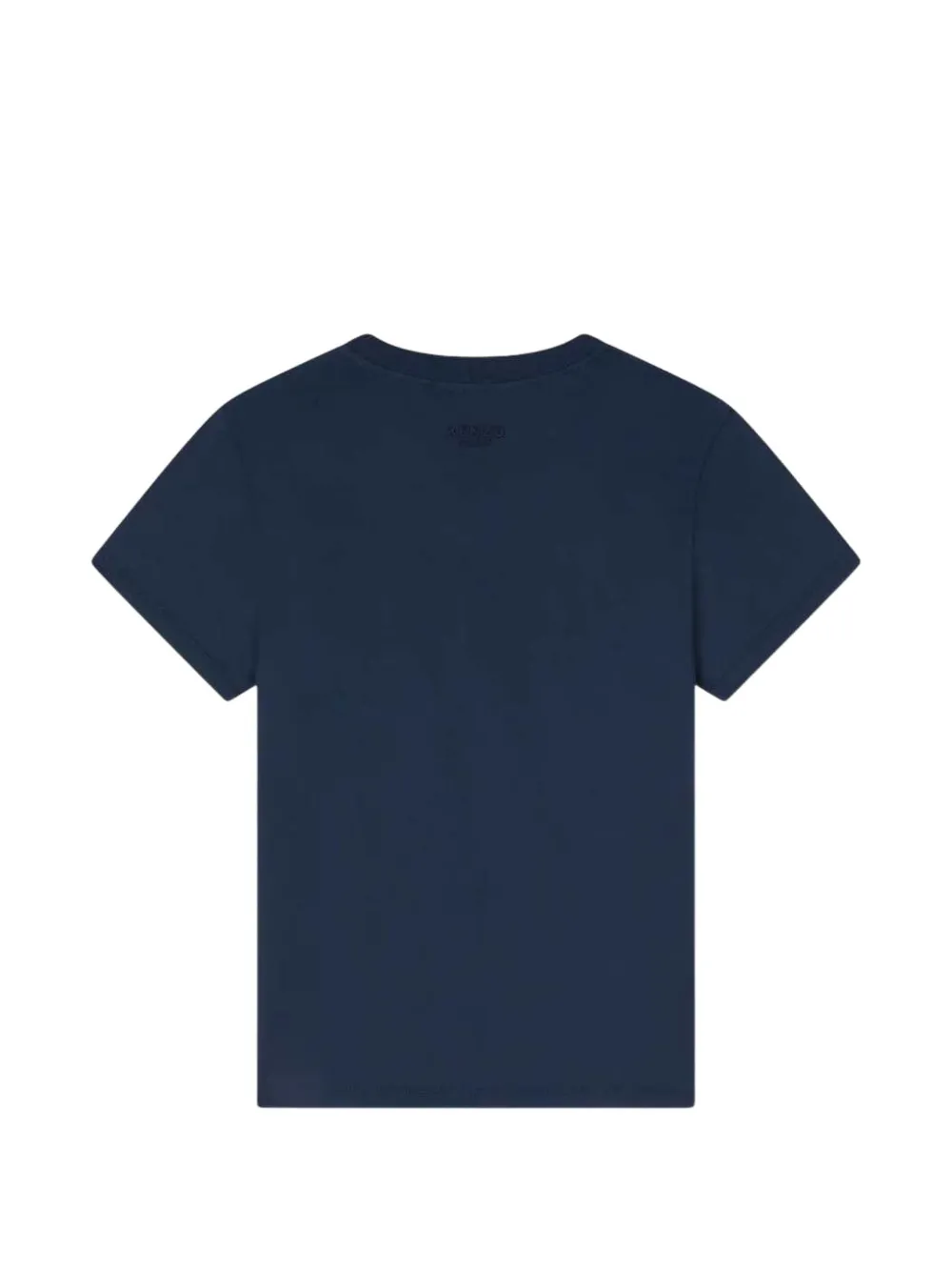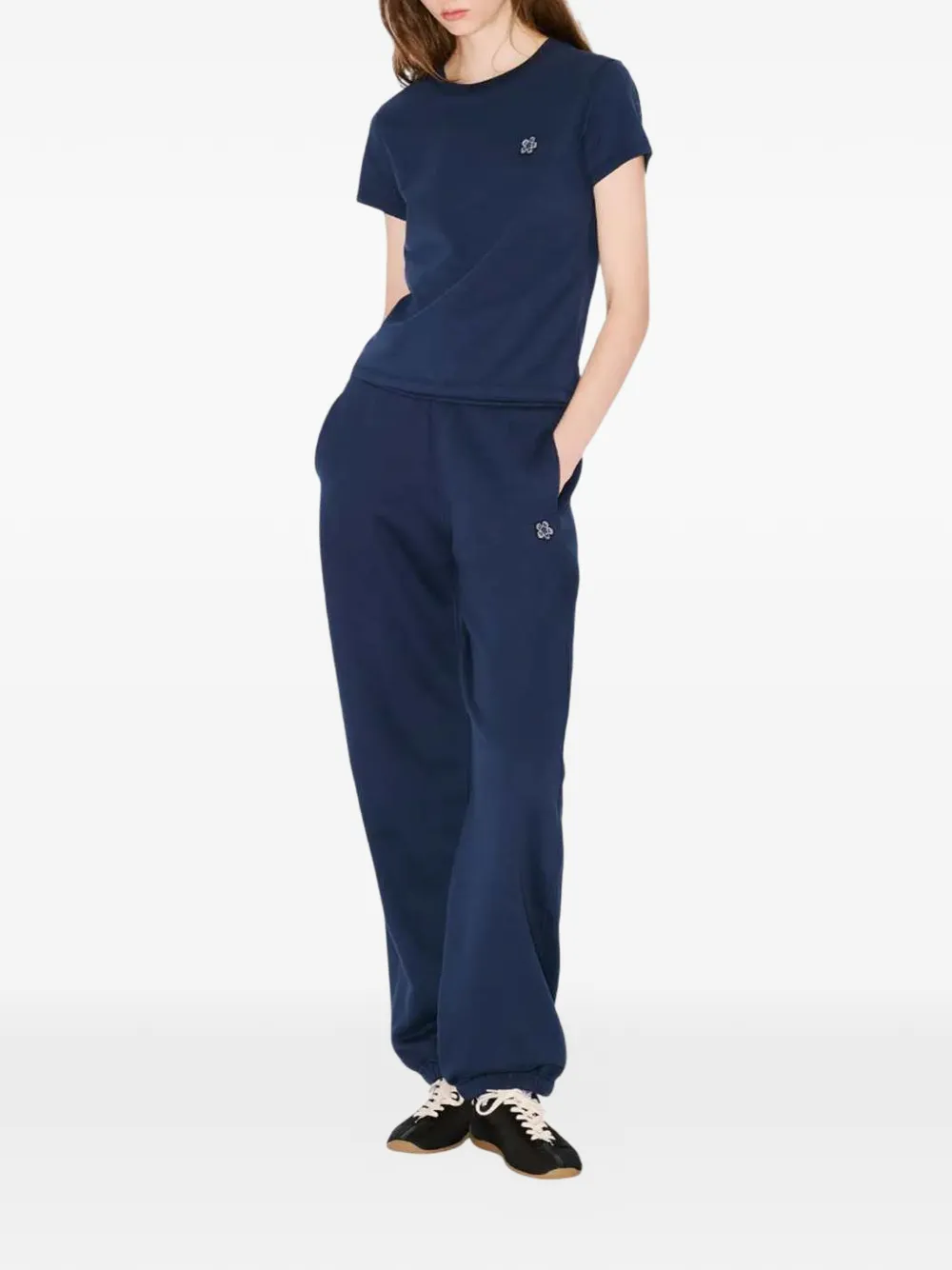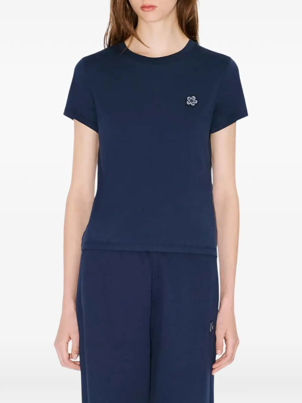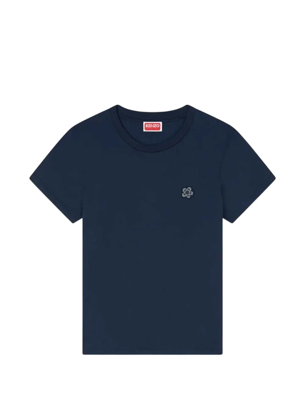 Темно-синяя футболка с фирменным мотивом цветка Боке, круглый вырез, короткие рукава, прямой подол