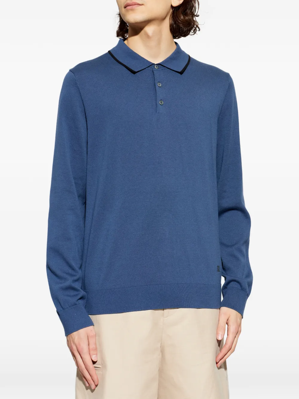 Синий цвет, детали с логотипом, застежка на пуговицы, отделка воротника, длинные рукава, ребристый низ