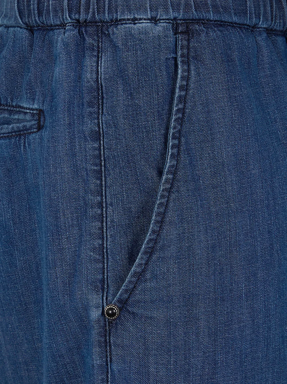 Синий цвет, эластичный пояс, застежка на пуговицу, задние карманы с клапанами, боковые прорезные карманы