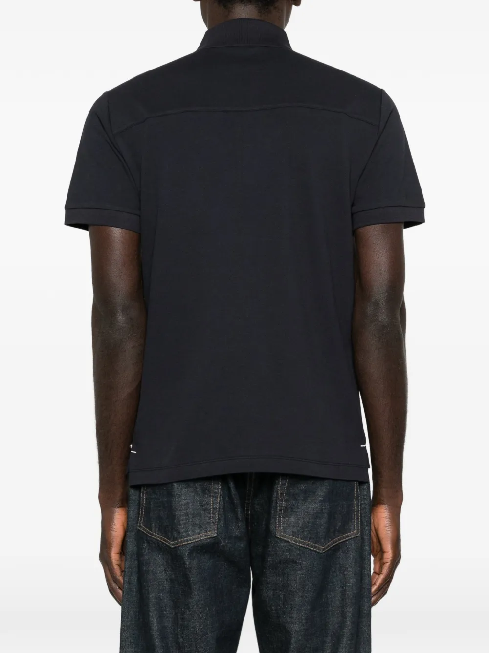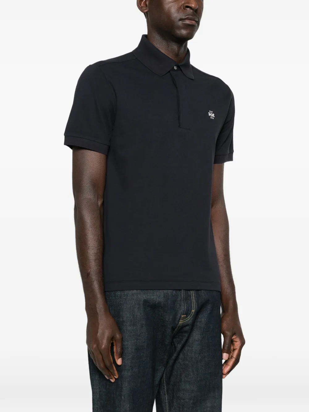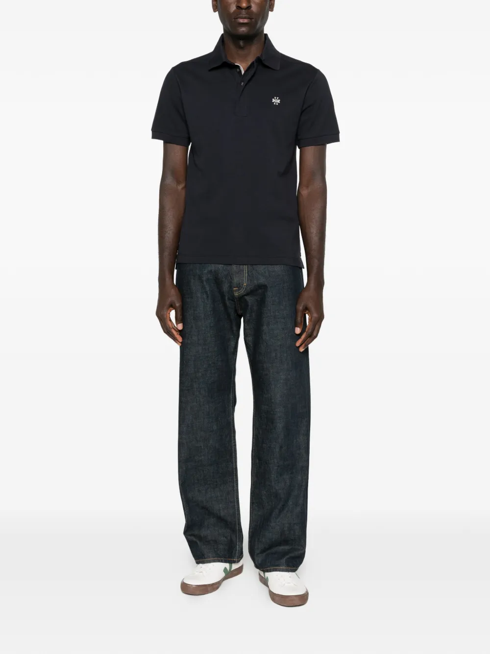 Темно-синее поло с вышитым логотипом, воротником, короткими рукавами, застежкой на пуговицы и прямым подолом
