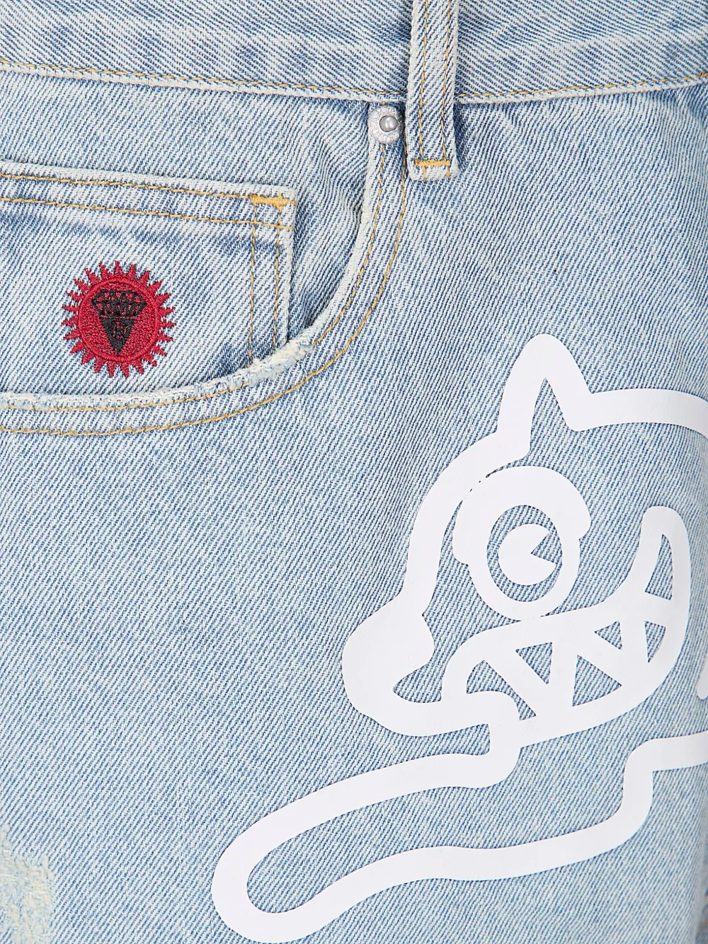 Синий цвет, вышитые детали, принт с изображением собаки, эффект состаренности, необработанные края, классические пять карманов