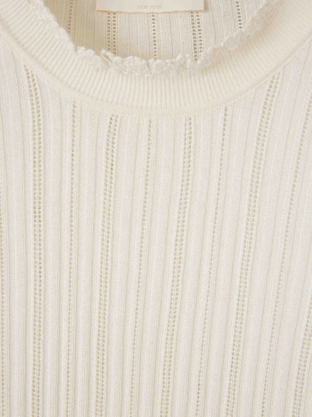 Белый вязаный топ в рубчик с V-образным вырезом, кружевной отделкой по низу и короткими рукавами