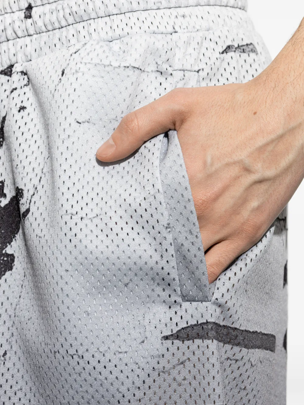 Светло-серый цвет с градиентным эффектом, перфорированный дизайн, боковые прорезные карманы, эластичный пояс