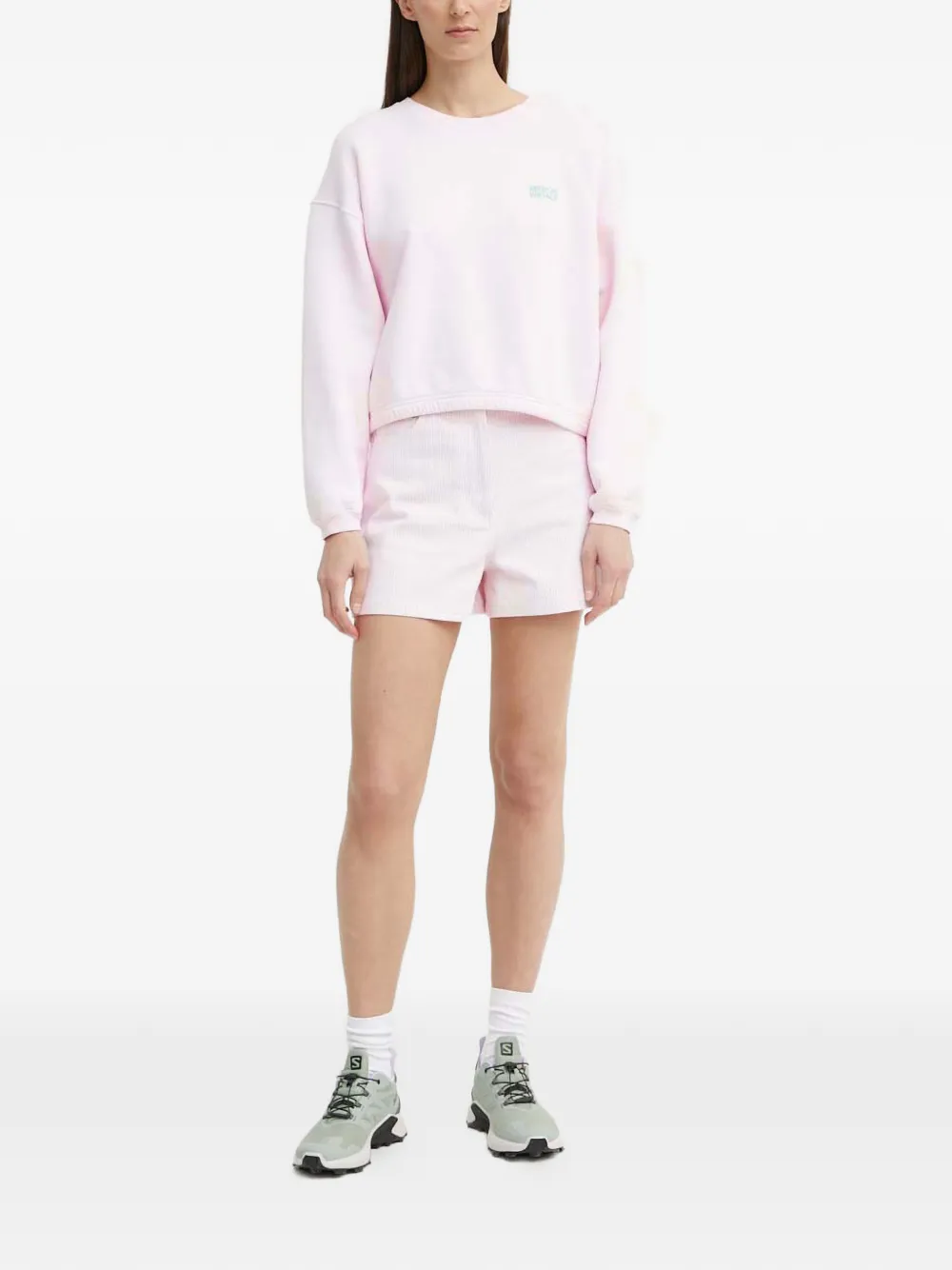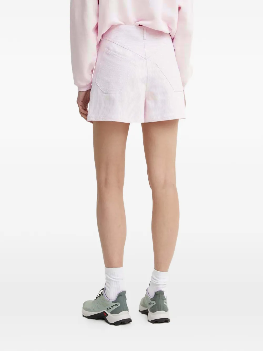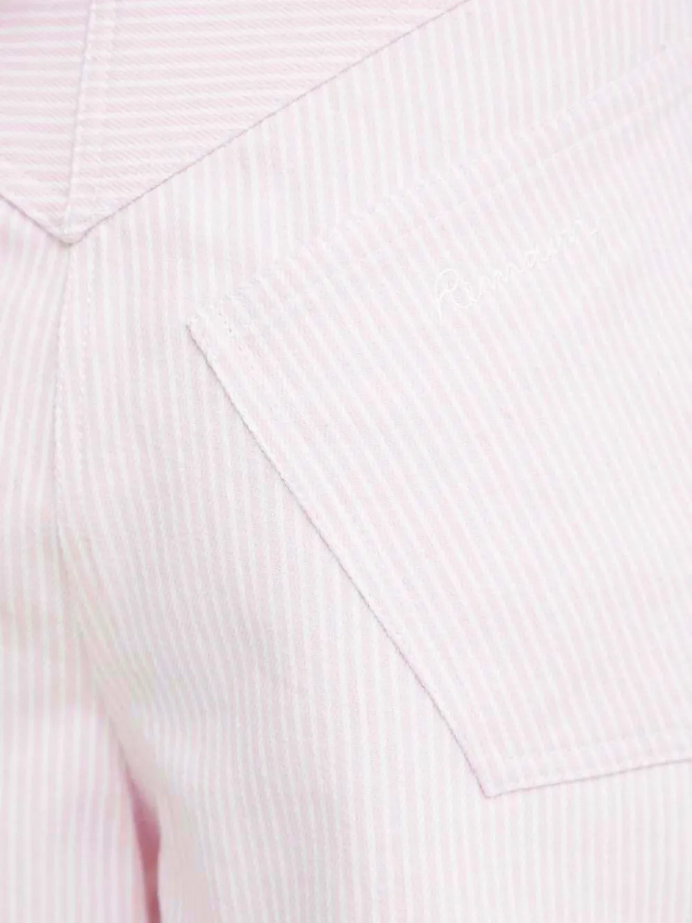 Светло-розовые в полоску, застежка на пуговицы, шлевки для пояса, задний карман