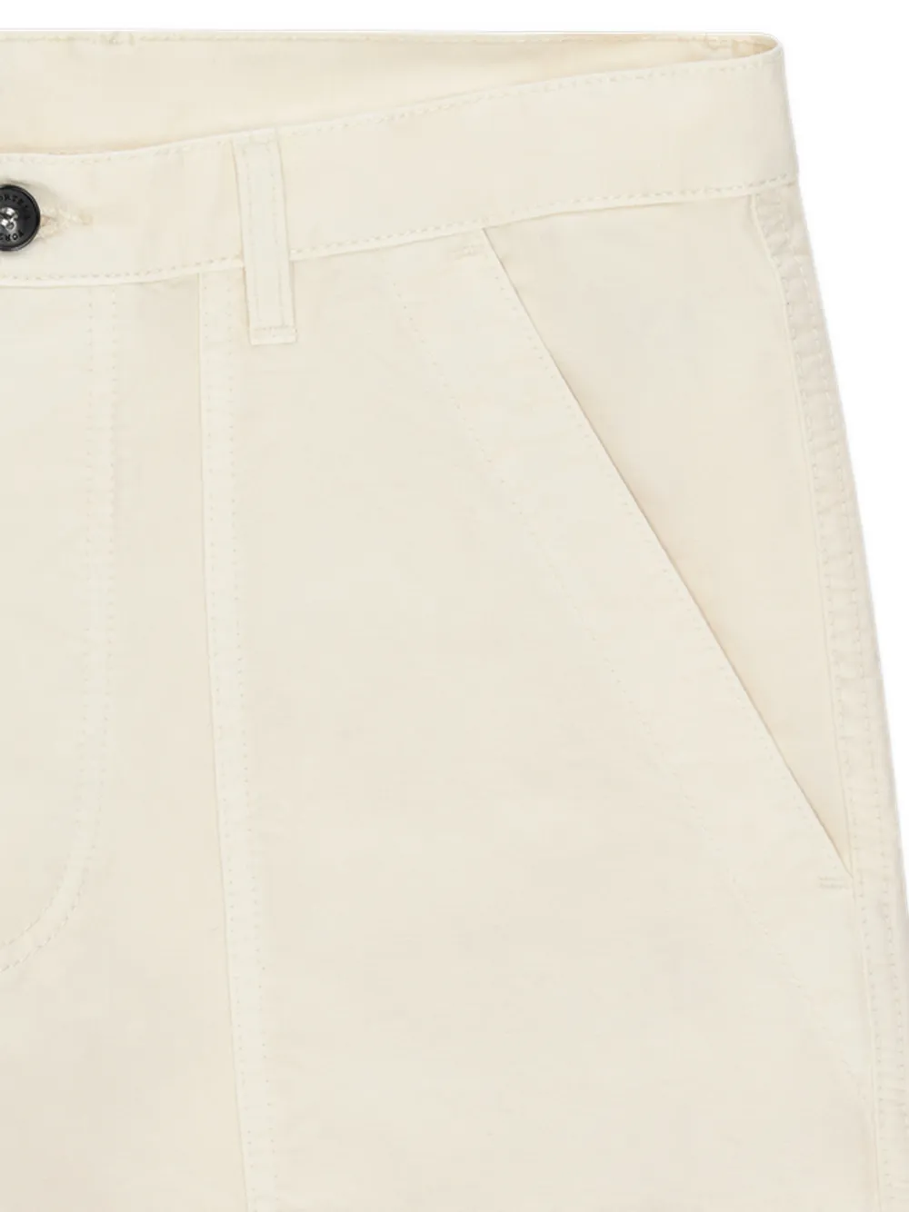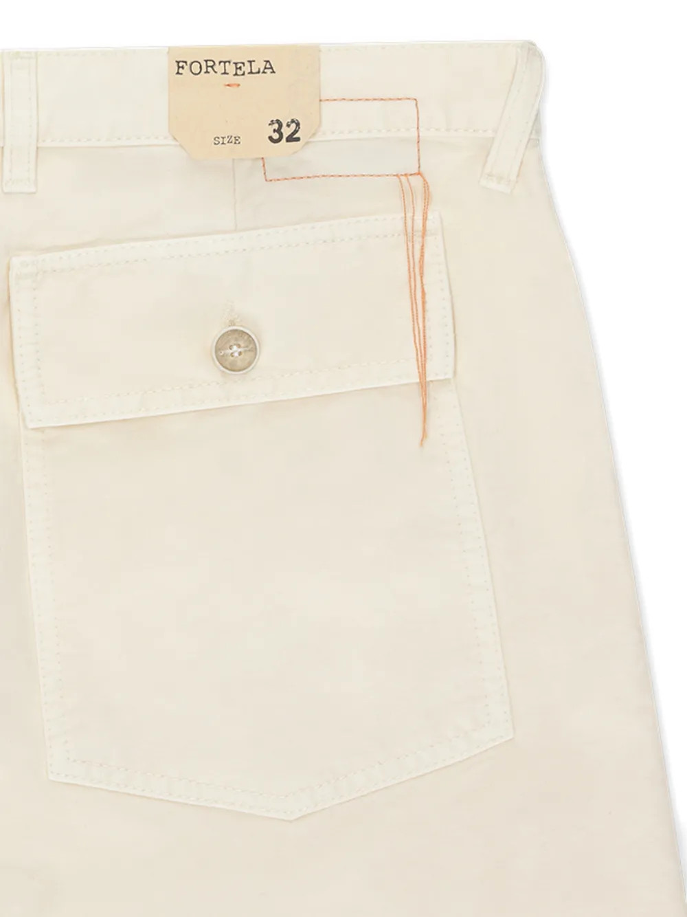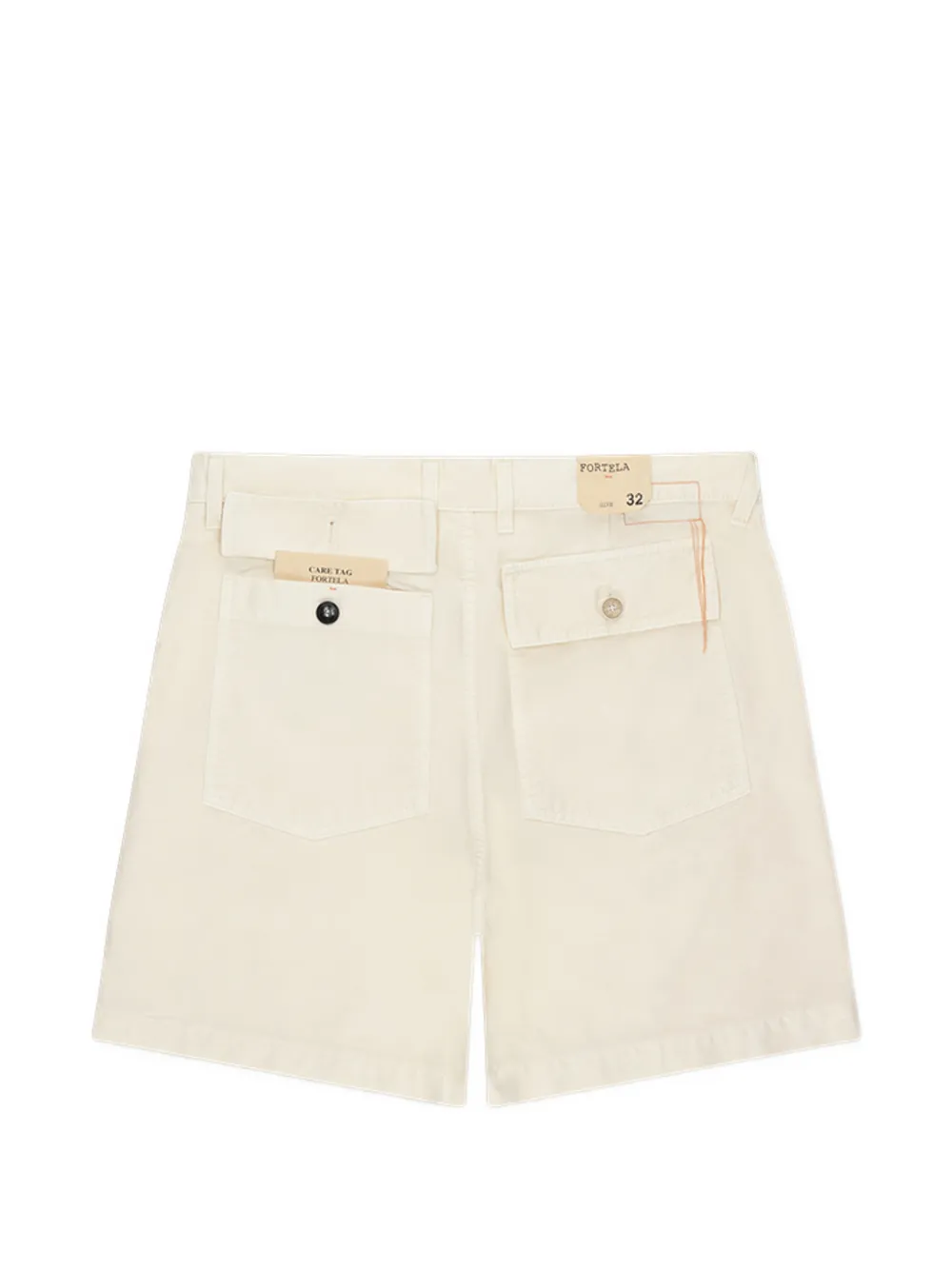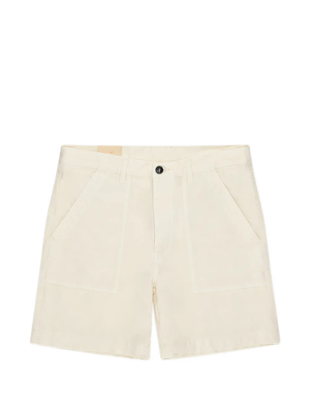 Сливочного цвета, задние карманы с клапанами, накладные карманы спереди, застежка на пуговицы, шлевки для ремня
