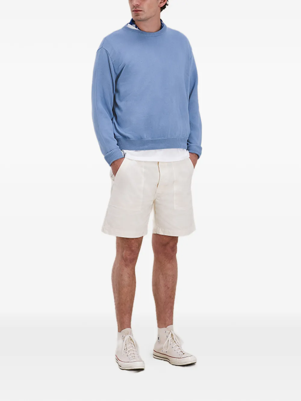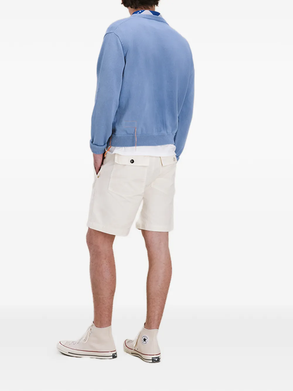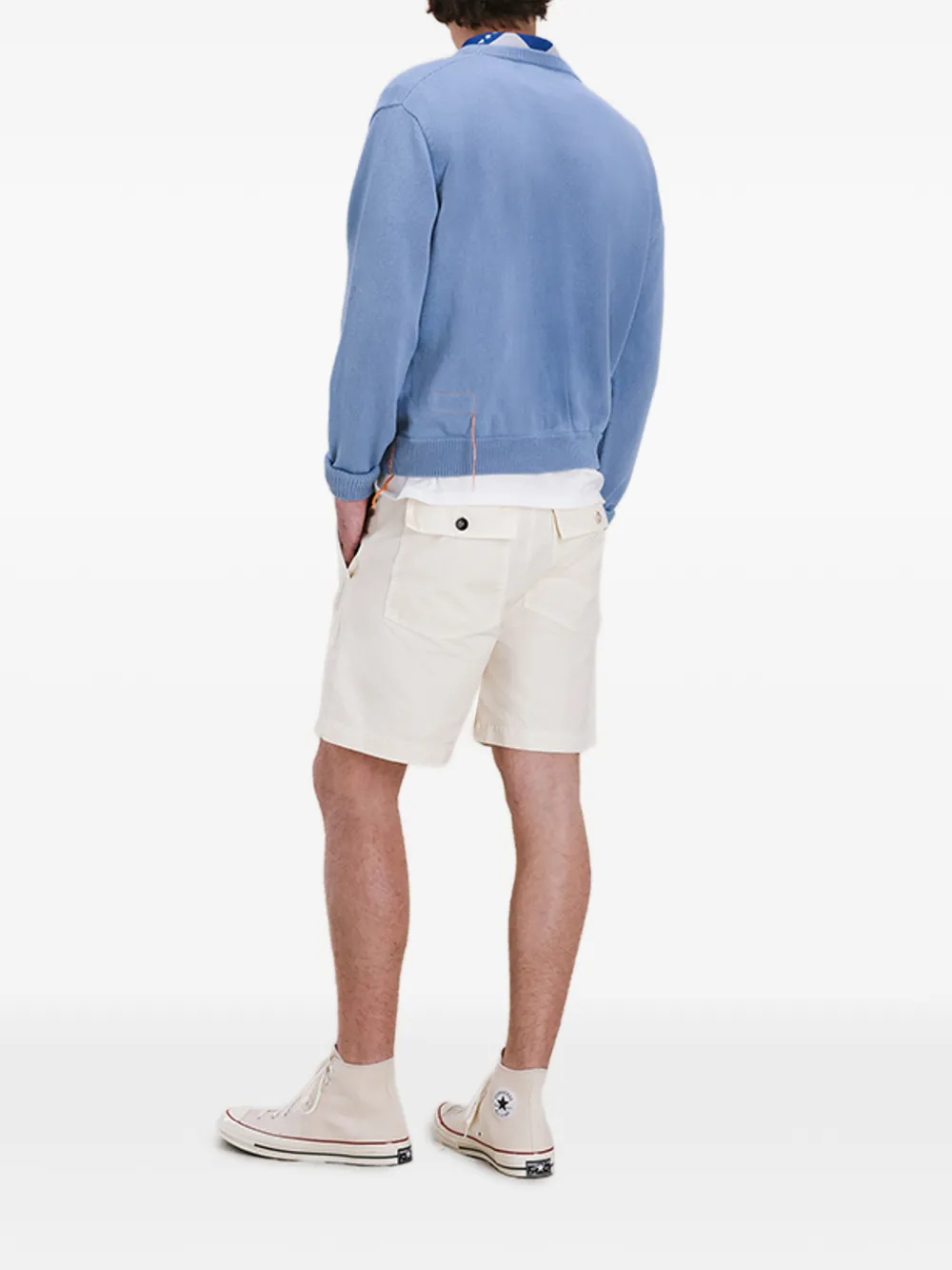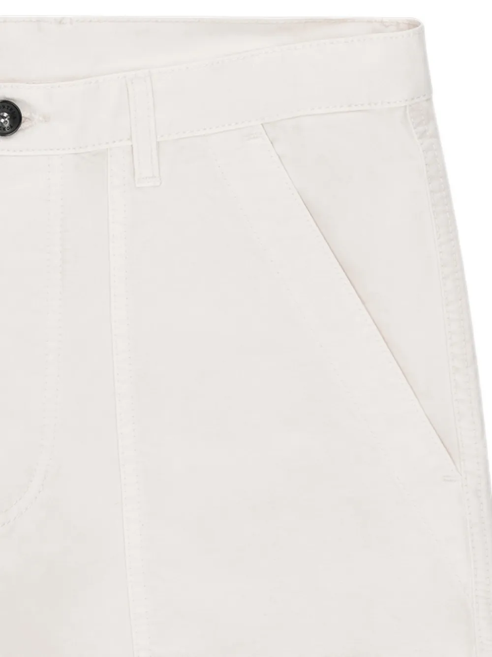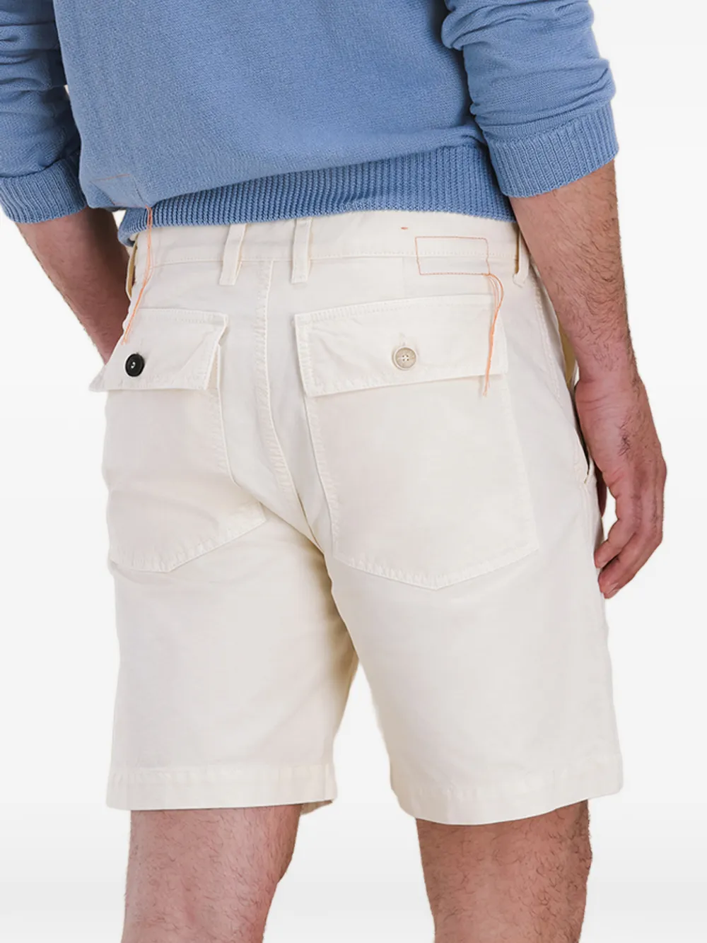 Сливочного цвета, задние карманы с клапанами, накладные карманы спереди, застежка на пуговицы, шлевки для ремня
