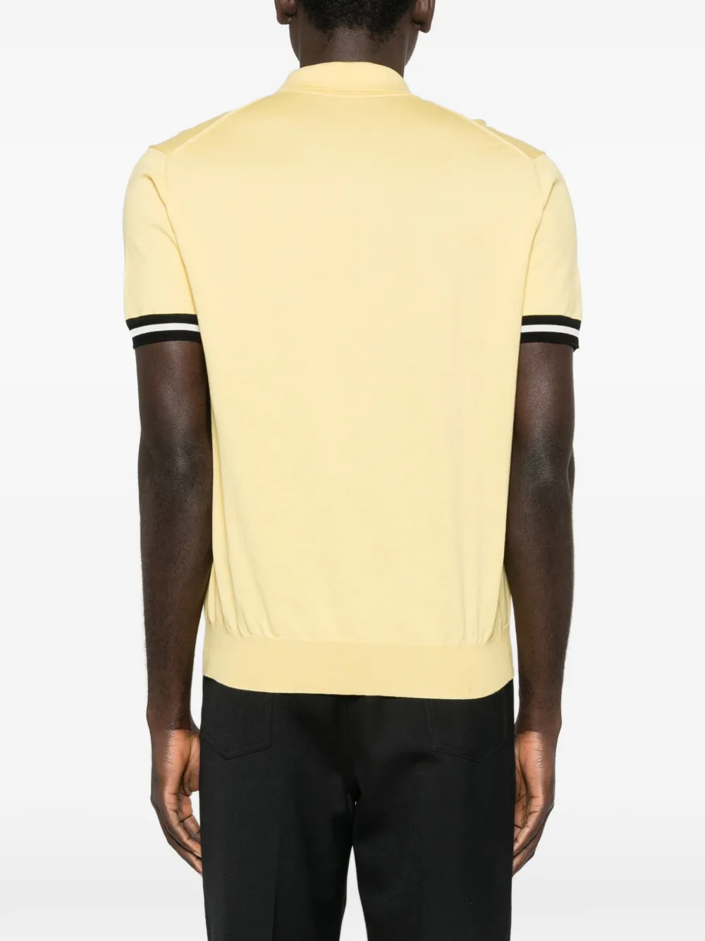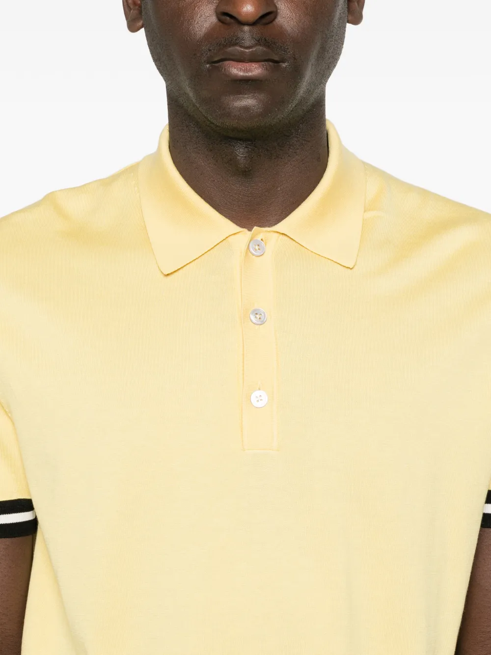 Желтые полосатые рукава, ребристый низ, отложной воротник, застежка на пуговицах спереди