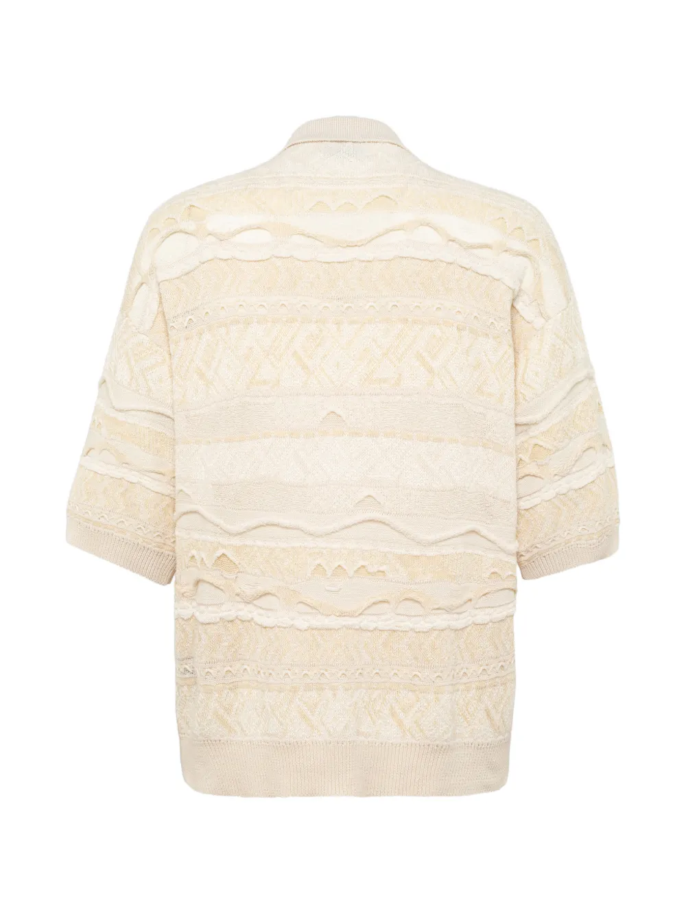 Бело-бежевый вязаный топ с короткими рукавами, накладным карманом и застежкой на пуговицы