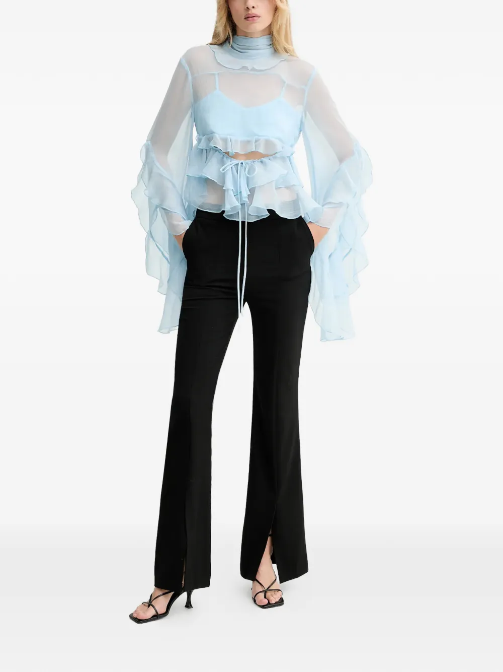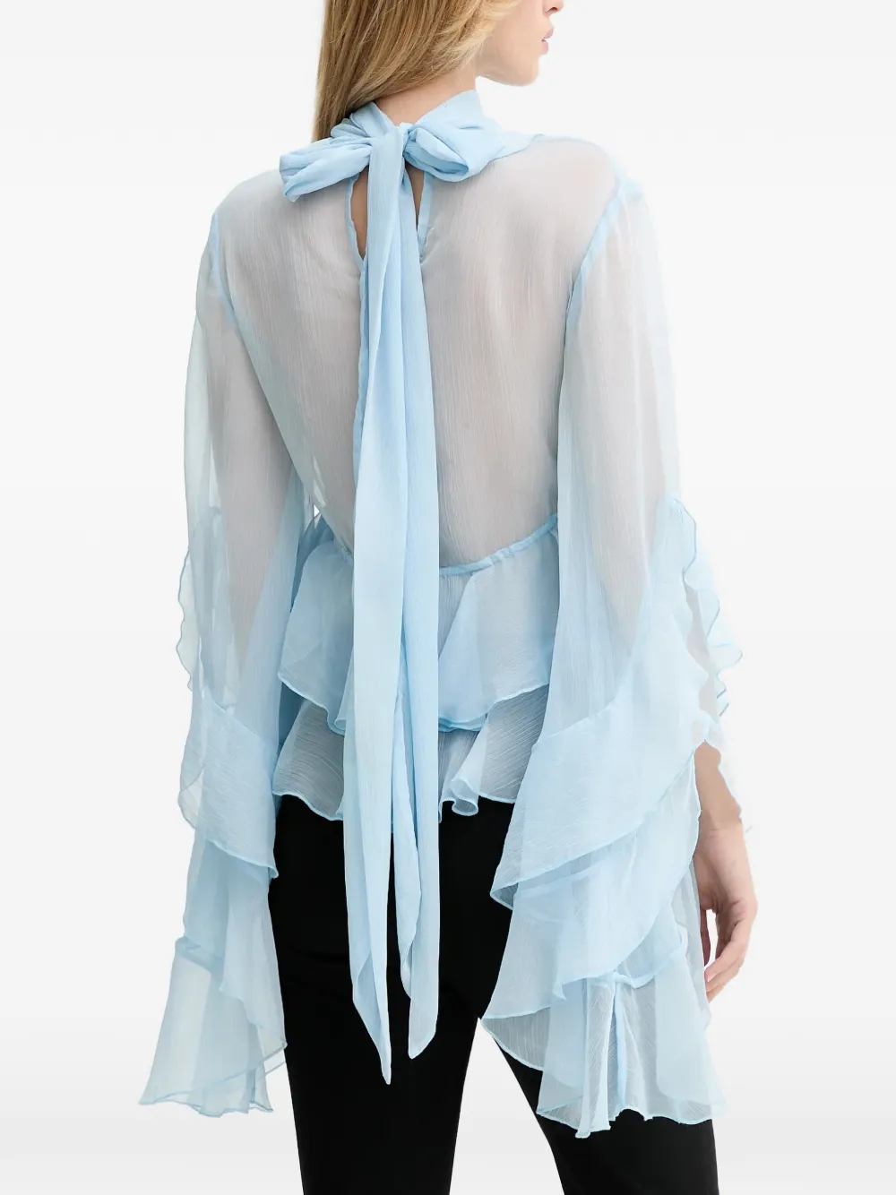 Светло-голубой цвет, оборчатая отделка, застежка-завязка сзади, длинные рукава, многослойный дизайн, высокий воротник