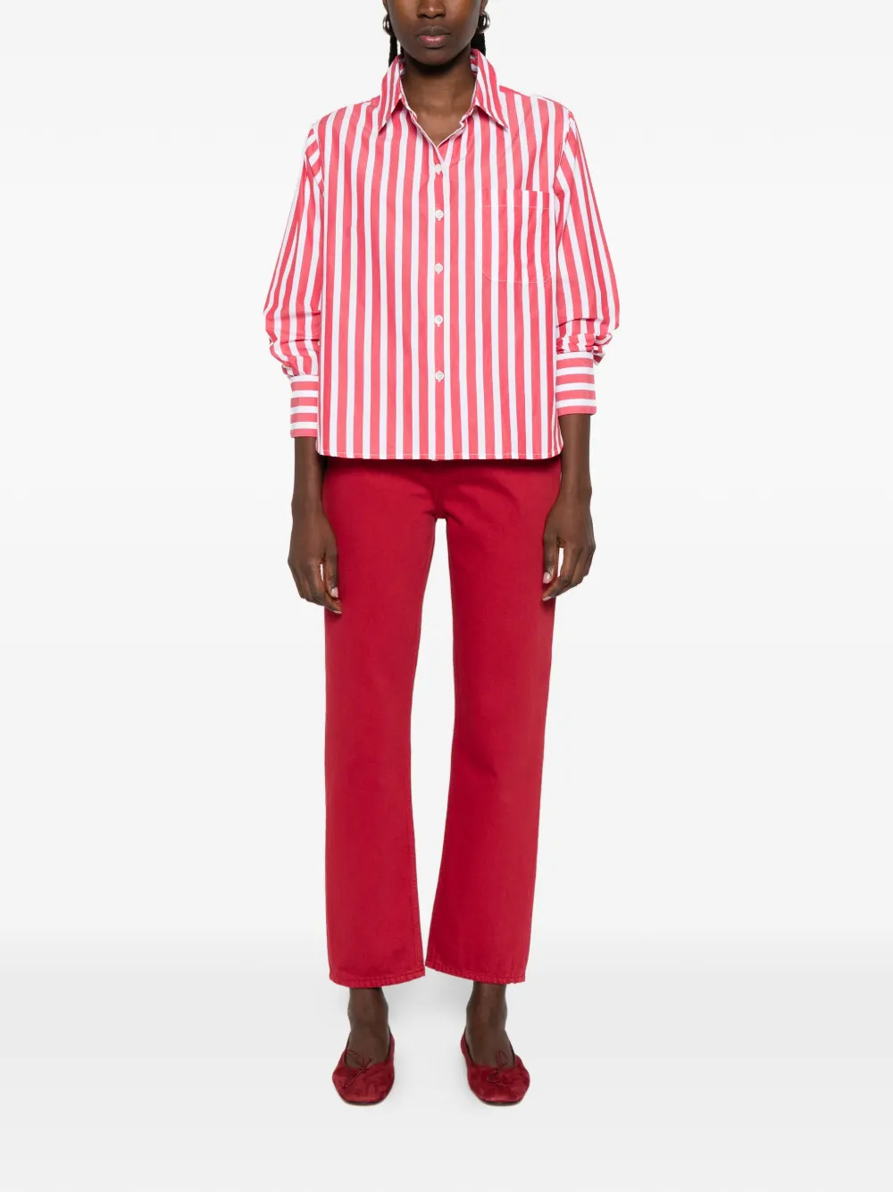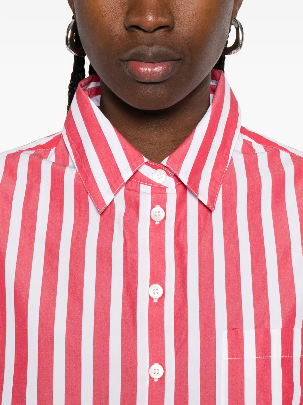 Красно-белые вертикальные полосы, нагрудный карман, застежка на пуговицы спереди, длинные рукава, манжеты на пуговицах