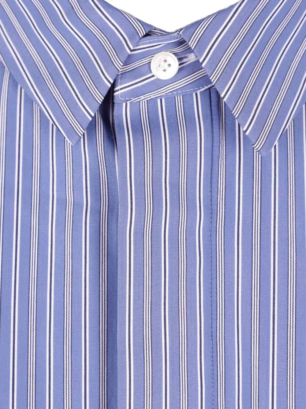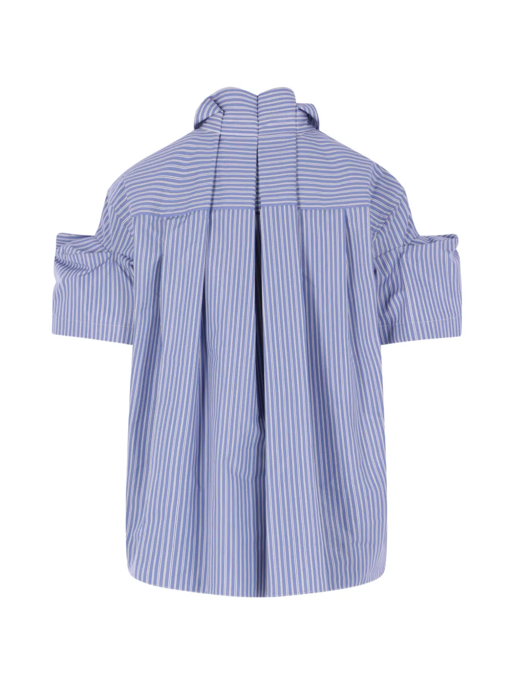Синяя рубашка в полоску с застежкой на пуговицы, накладным карманом, короткими рукавами и вырезами на плечах