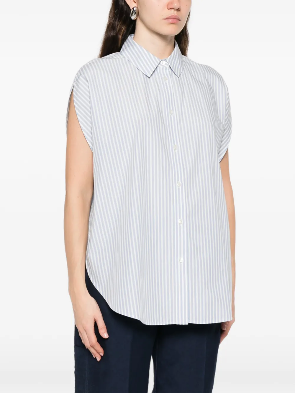 Голубой с полосатым узором, застежка на пуговицы, заостренный воротник, длинные рукава, манжеты на пуговицах