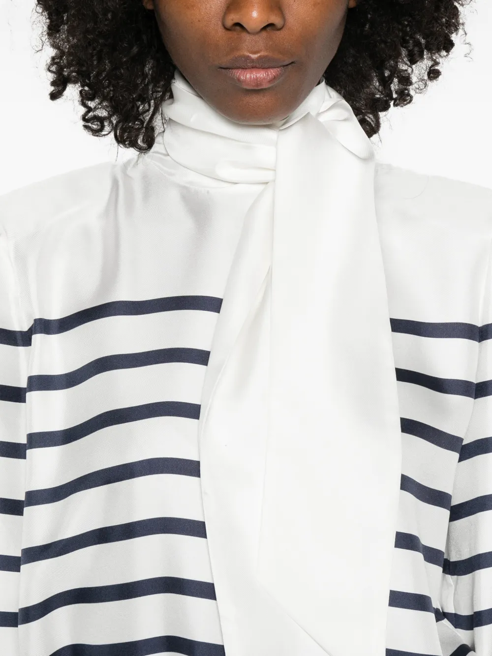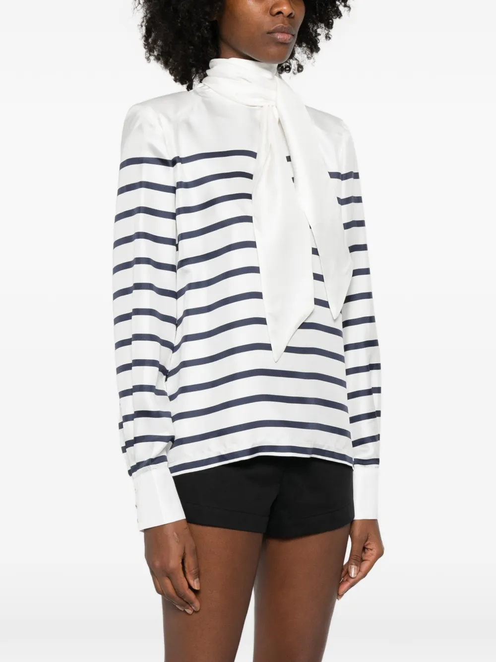 Белая/темно-синяя полосатая шелковая блузка с бантом, длинными рукавами и отворотами на манжетах