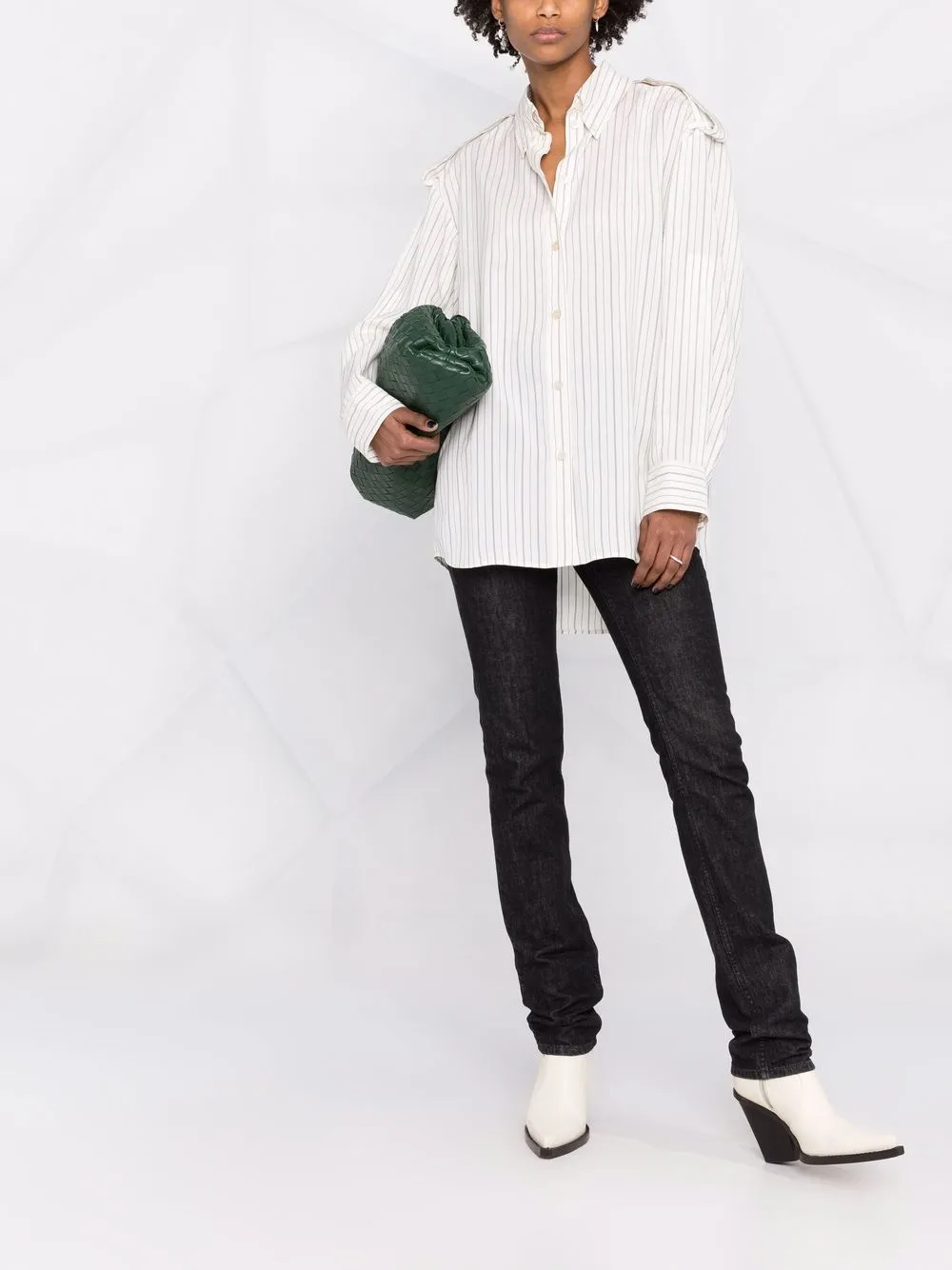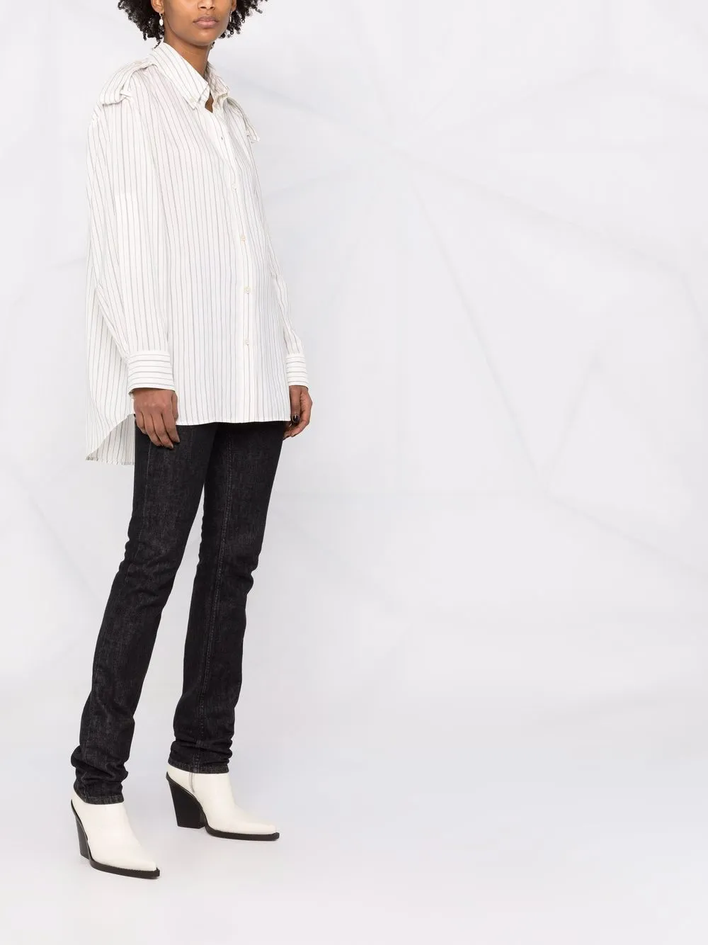 Узор в тонкую полоску, классический воротник, приспущенные плечи, длинные рукава и застежка на пуговицах спереди.