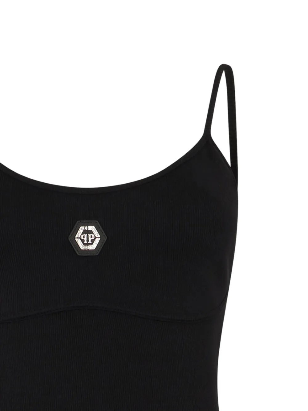 Черное в рубчик, тонкие бретели, нашивка с логотипом, длина выше колена, круглый вырез