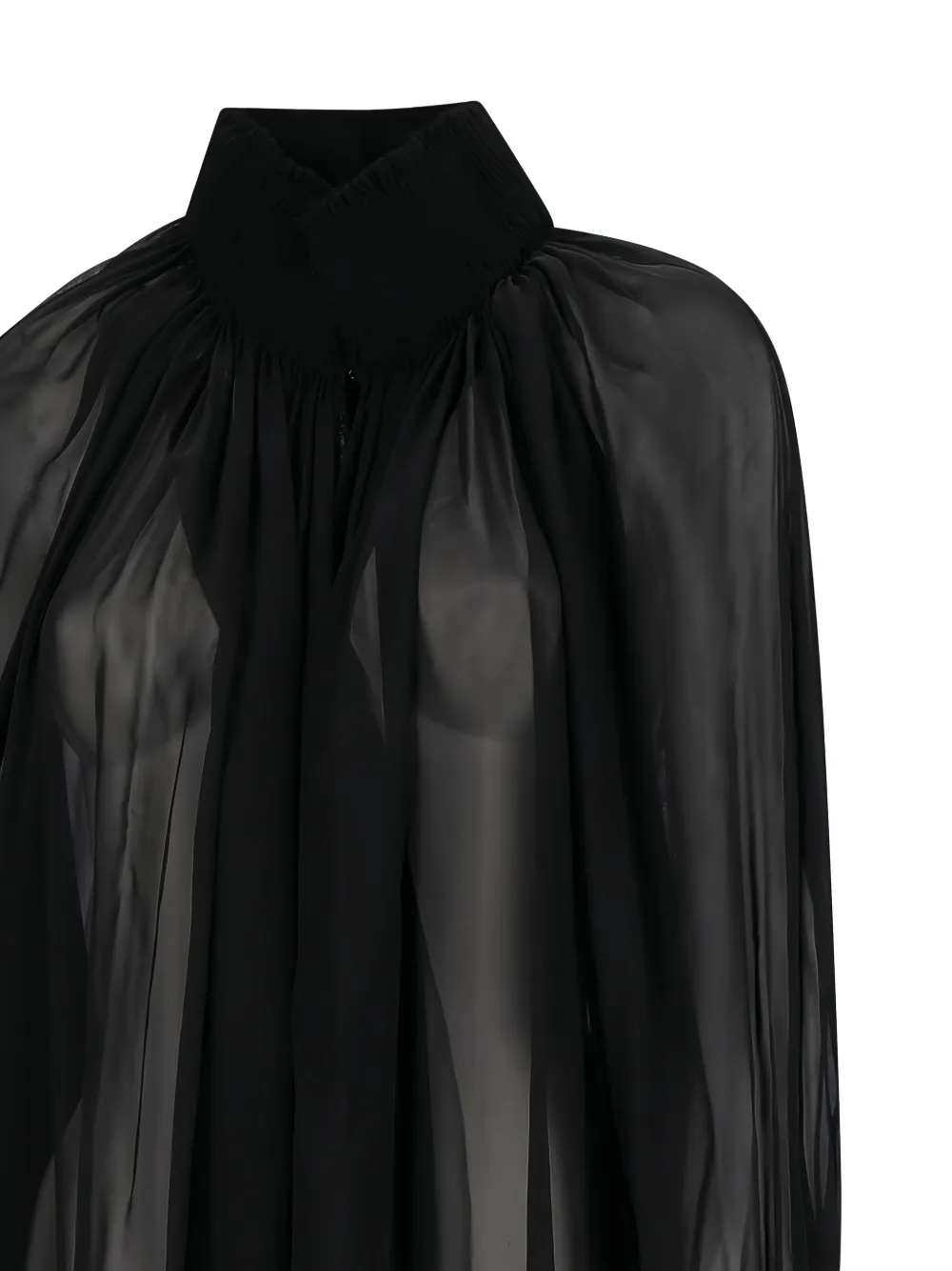 Черная полупрозрачная отделка, высокий воротник, длинные рукава, манжеты с оборками, асимметричный подол