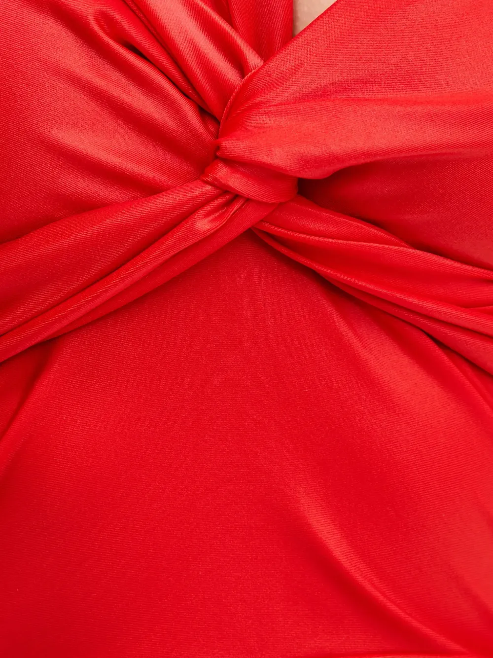 Красный шарф-декор, бретели-спагетти, V-образный вырез, узел, присборенные детали