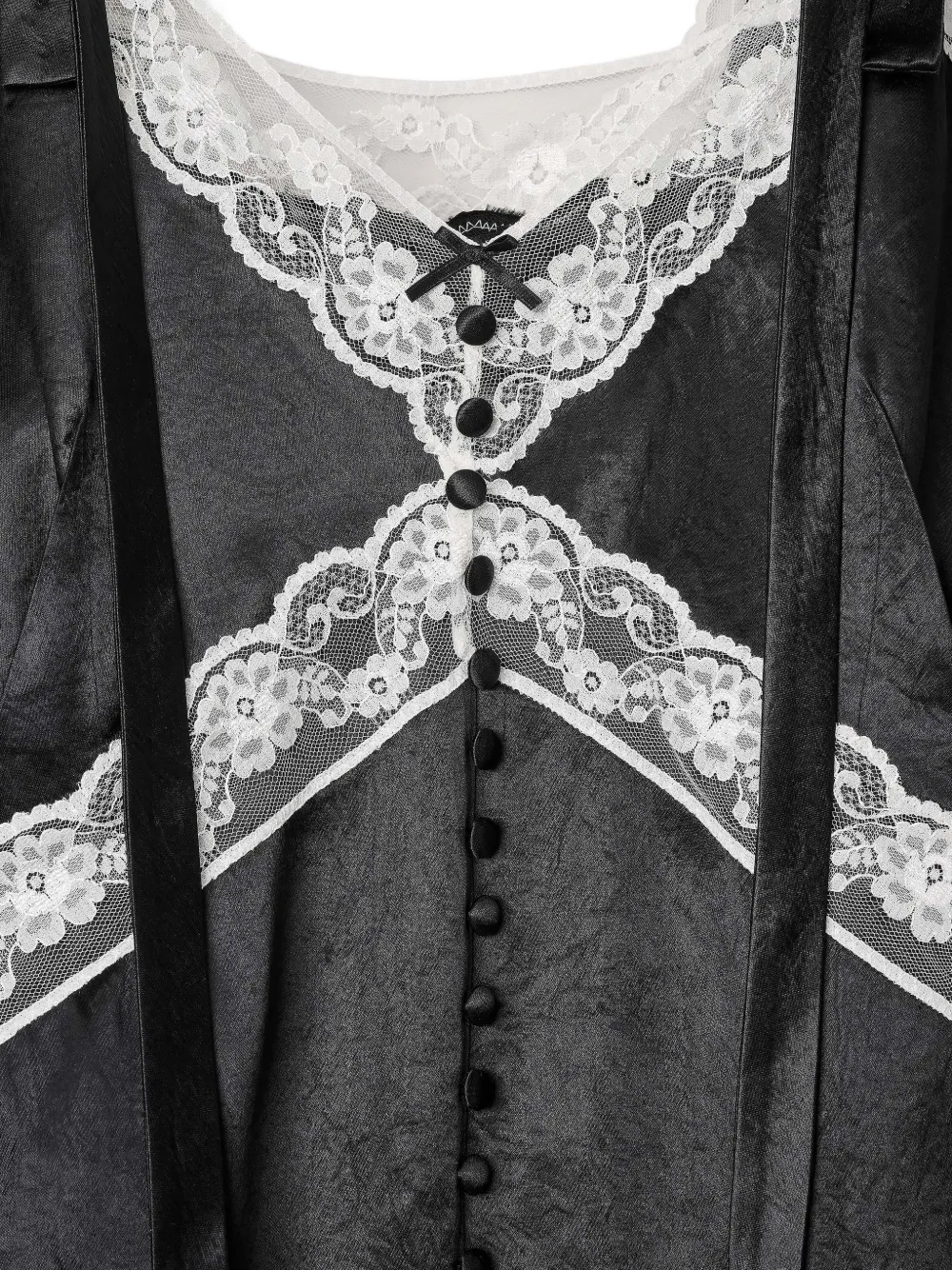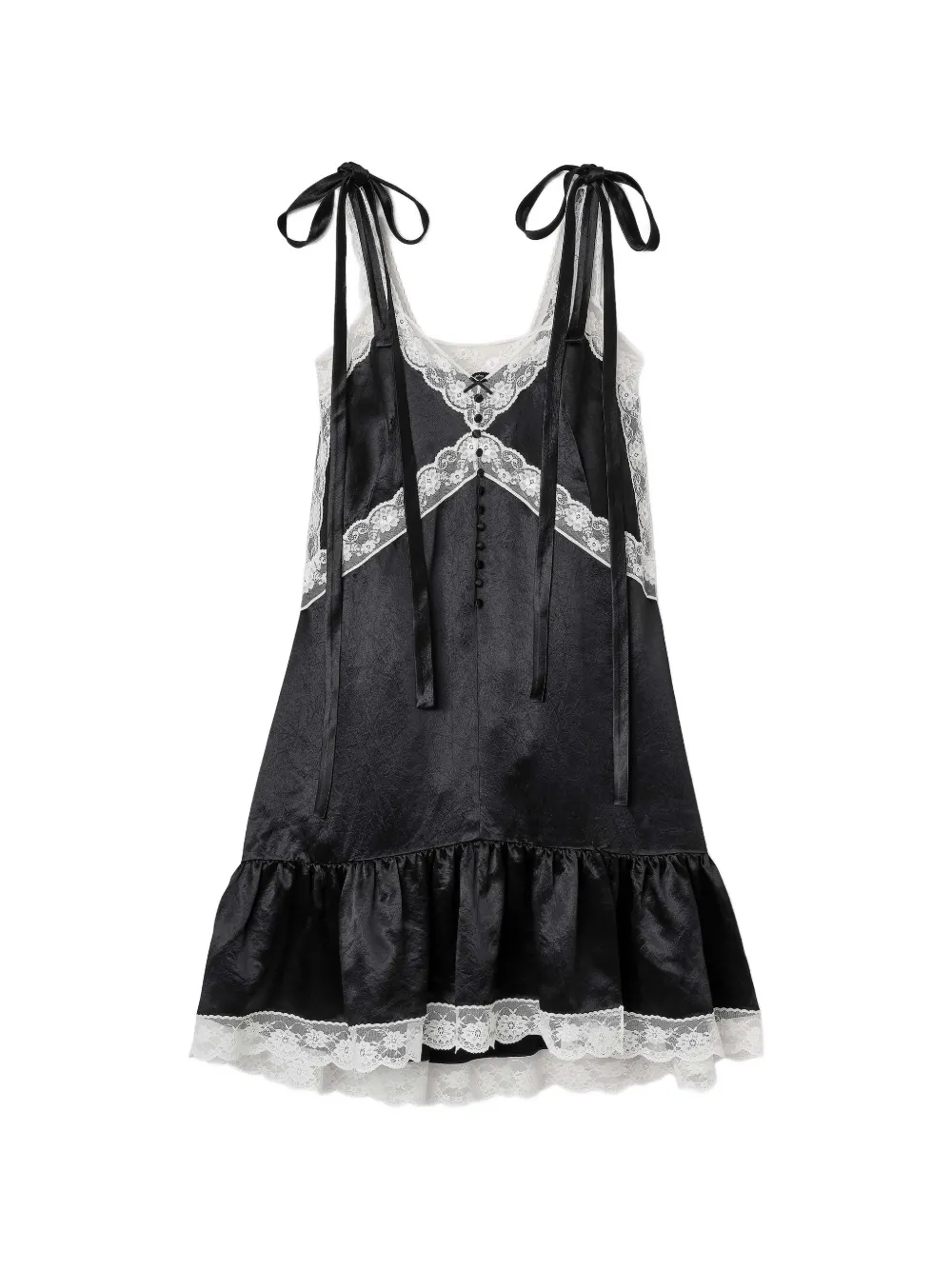 Черные кружевные детали, лента, застежка на пуговицы, оборчатый подол, без рукавов