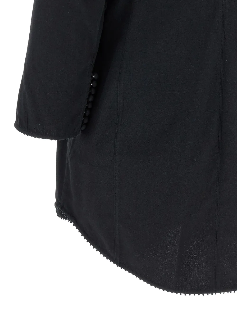 Черная футболка с круглым вырезом, застежкой на пуговицы спереди, длинными пышными рукавами и оборками
