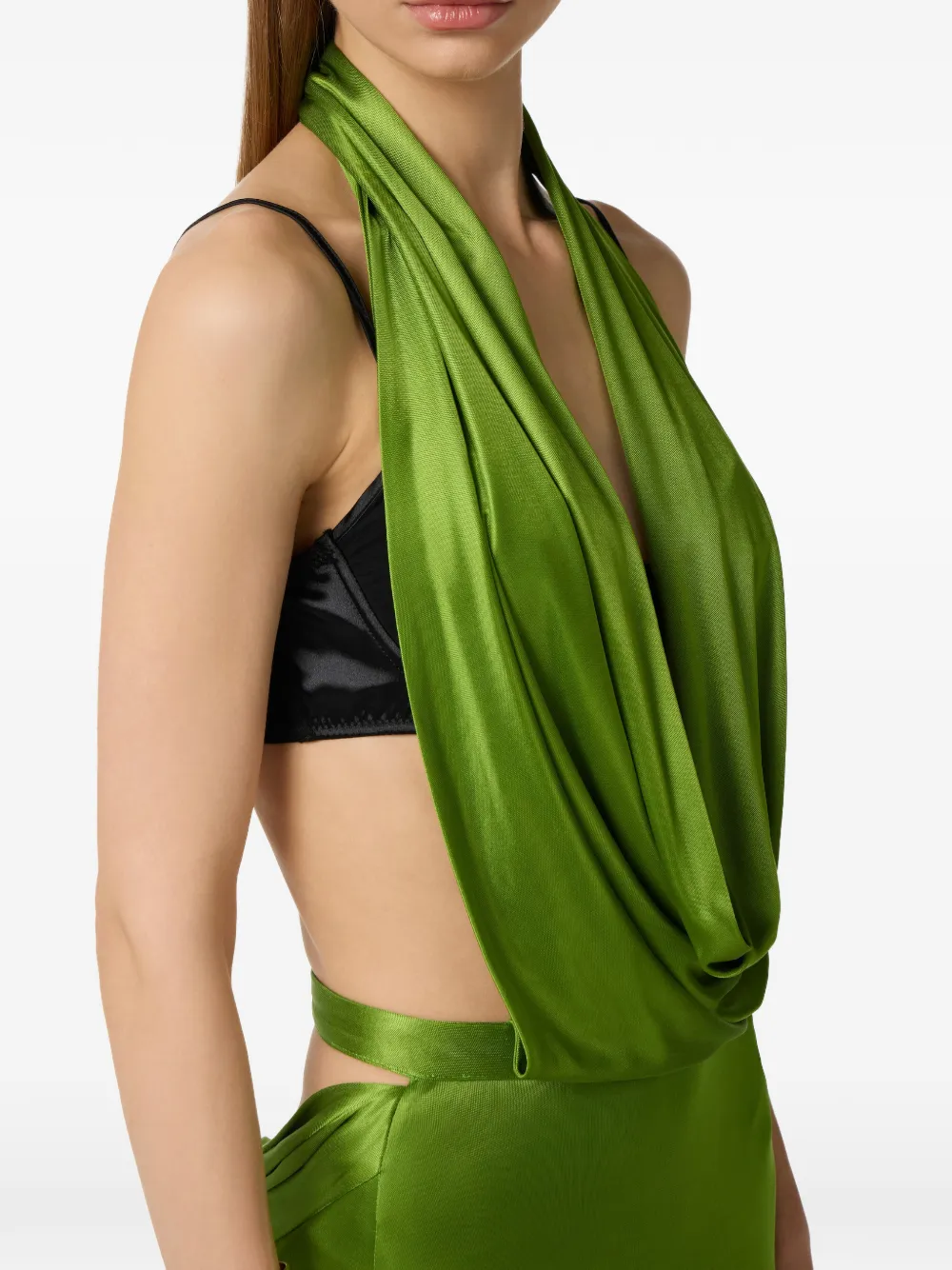 Зеленое платье без рукавов с открытой спиной и драпировкой