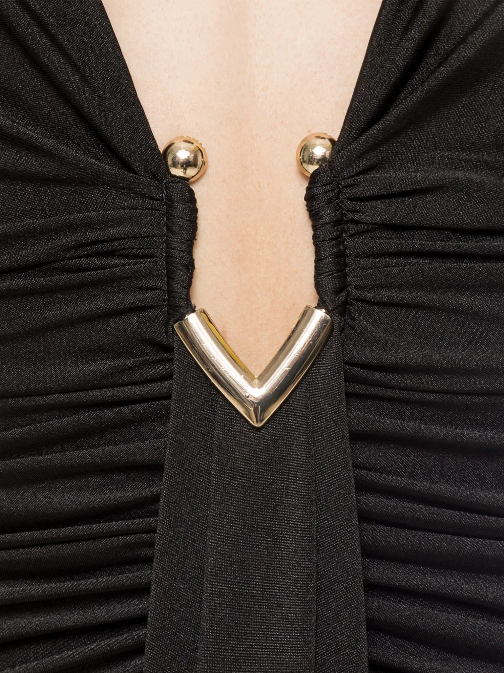 Черное мини-платье с V-образным вырезом, длинными рукавами, фурнитурой золотистого оттенка и драпировкой