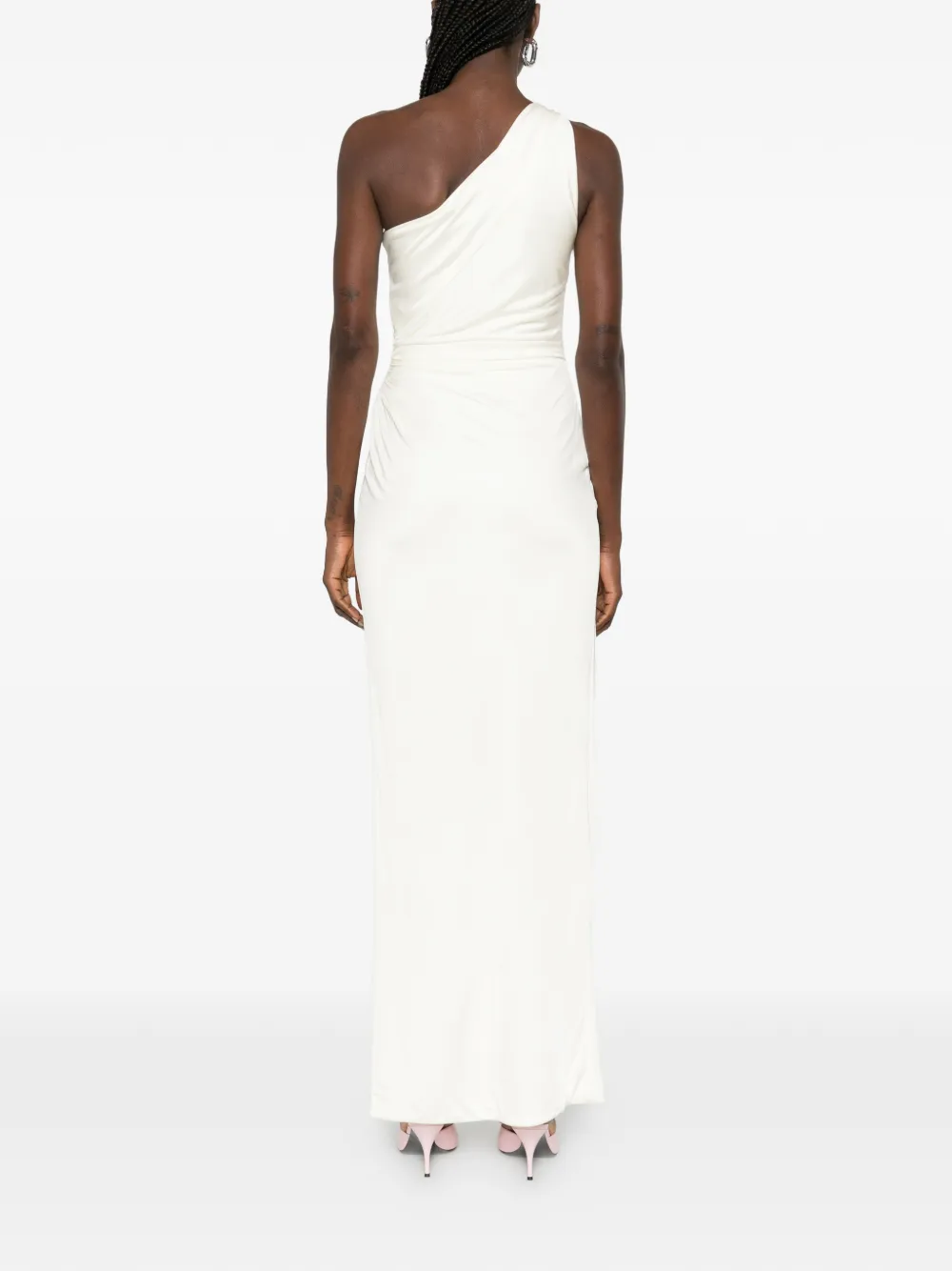 Платье цвета яичной скорлупы на одно плечо с драпировкой, присборенными деталями и без рукавов