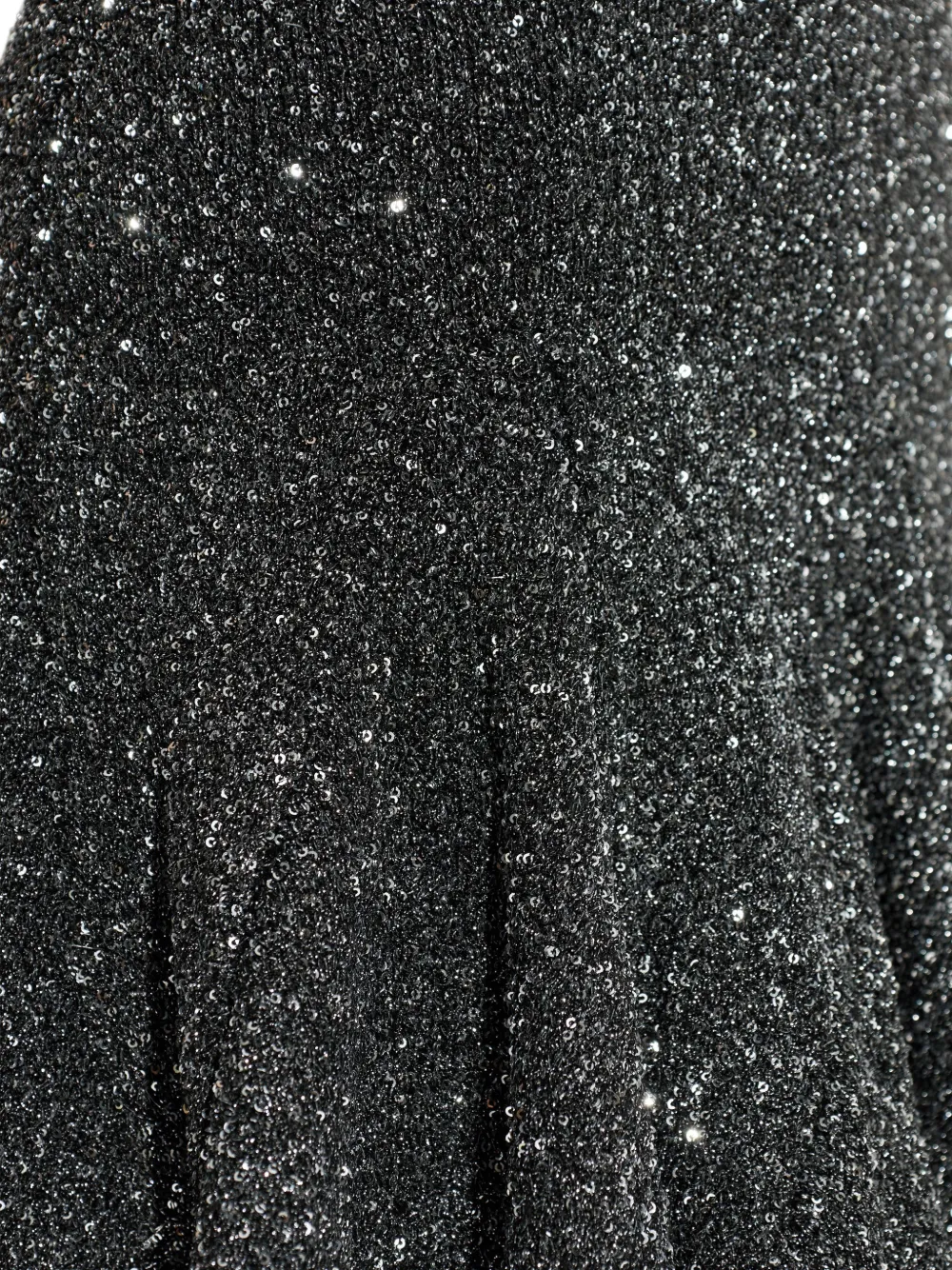 Черная отделка пайетками, расклешенный подол, круглый вырез, без рукавов