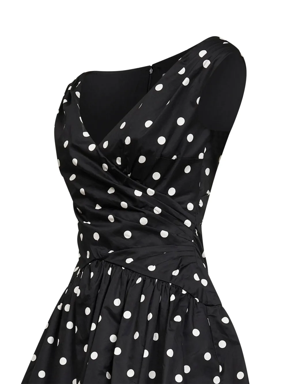 Черное платье в горошек с вырезом «сердечко», расклешенной юбкой, без рукавов, со сборками