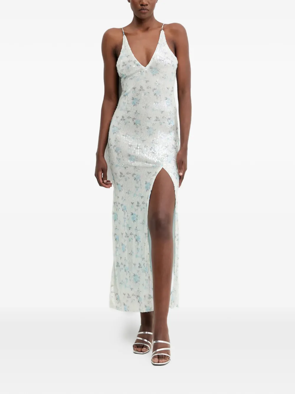 Небесно-голубое платье с пайетками, цветочным принтом, V-образным вырезом, боковым разрезом и тонкими бретелями