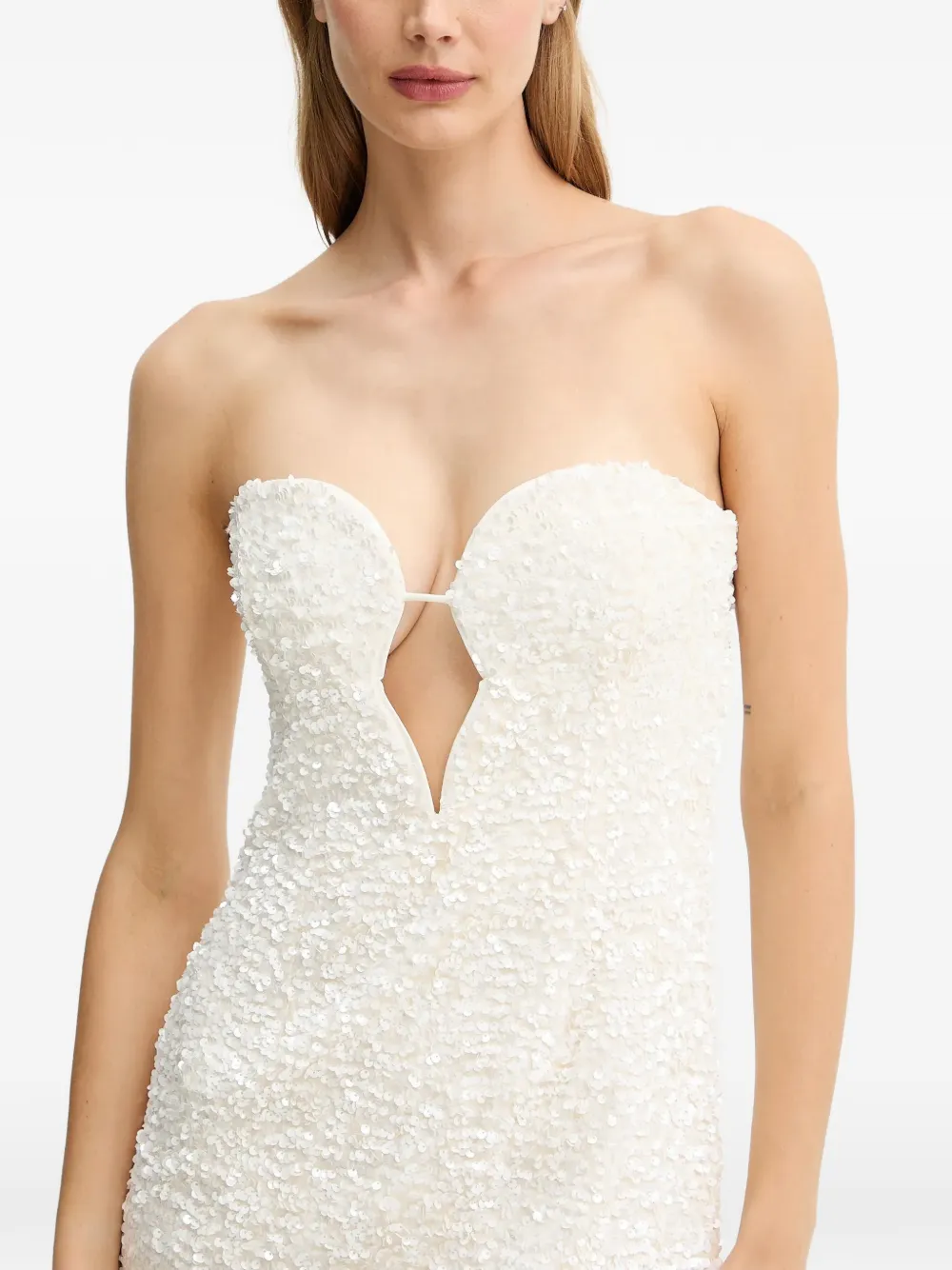 Белое платье с вырезами, без бретелек, застежка-молния сзади, разрез сзади